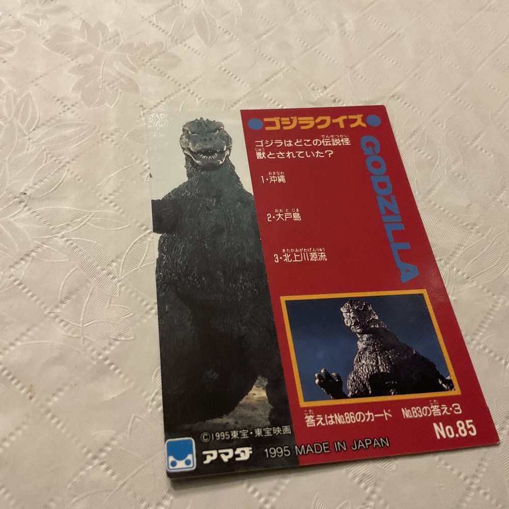 This 1995 Godzilla Collection Japan Trading Card #85 is a must-have for any avid collector of non-sport trading cards. With its unique features including a checklist and its association with the iconic Godzilla franchise, it is sure to be a valuable addition to your collection. Manufactured in Japan in 1995, this card is in very good condition, reflecting the attention and care taken in its production. Whether you are a fan of Godzilla or simply enjoy collecting trading cards, this item is sure to meet your expectations.