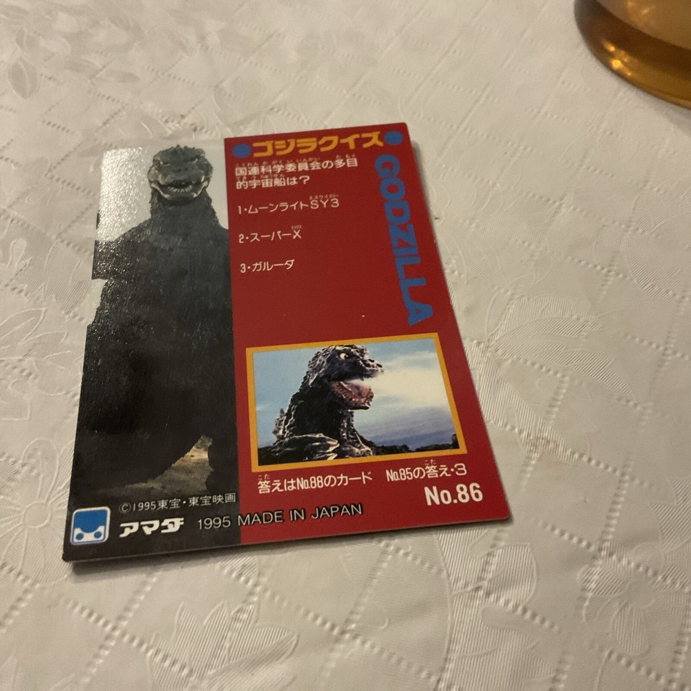 Enhance your Non-Sport Trading Card collection with this rare 1995 Godzilla Collection Japan Trading Card #86. This card features a checklist, making it a must-have for any collector. Manufactured in Japan, this card is in very good condition, perfect for display or storage. The card belongs to the Godzilla franchise and was manufactured in 1995. It is an ungraded Non-Sport Trading Card, making it a unique addition to your collection. Don't miss out on this opportunity to own a piece of history.