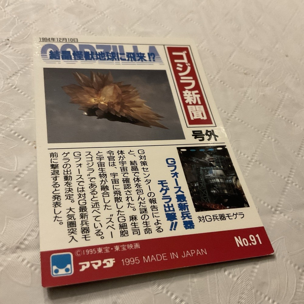 This 1995 Godzilla Collection Japan Trading Card #91 is a must-have for any fan of the franchise. The card features a checklist and is manufactured in Japan, adding to its authenticity. Its card condition is very good, making it a great addition to any non-sport trading card collection. It was manufactured in 1995, adding to its rarity and value. The card is ungraded and has not been evaluated for its condition by a professional grading service. This item falls under the Collectibles and Non-Sport Trading Cards categories and is a Trading Card Single. Add this unique piece to your collection today!