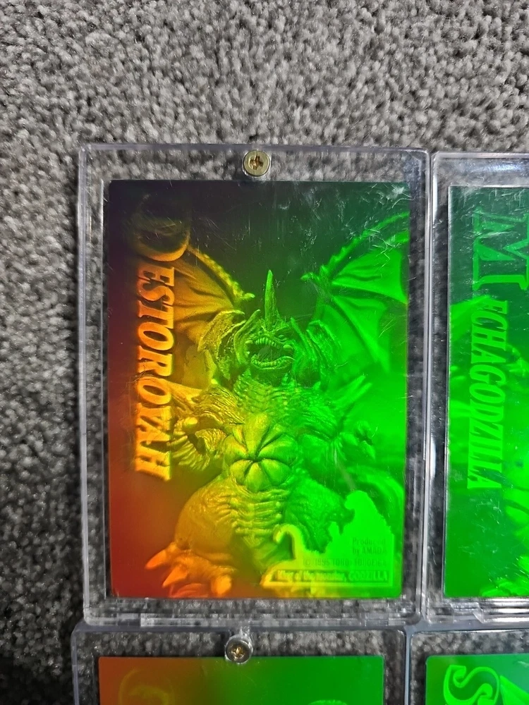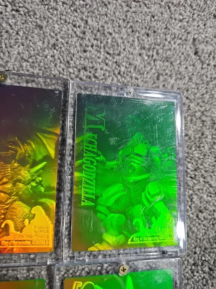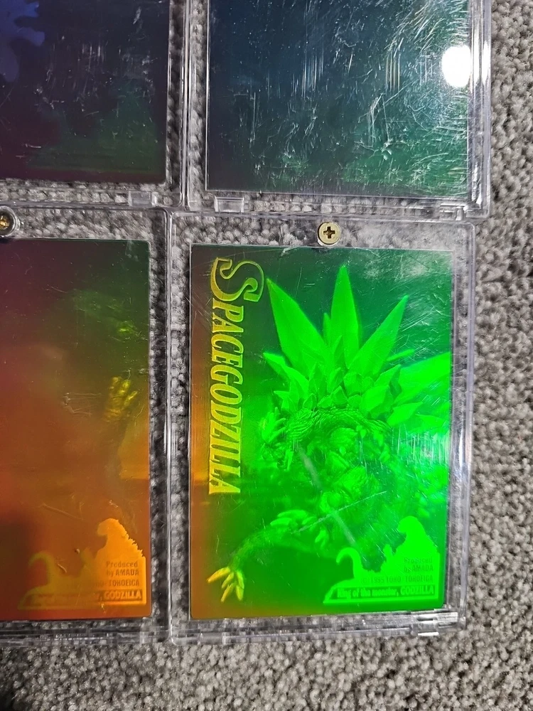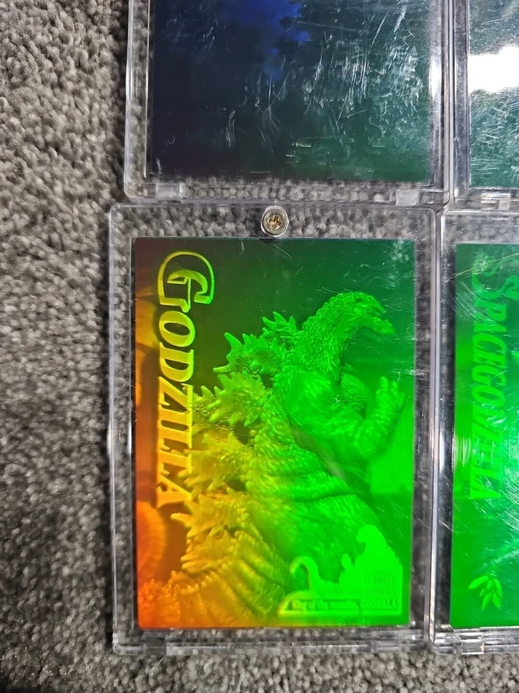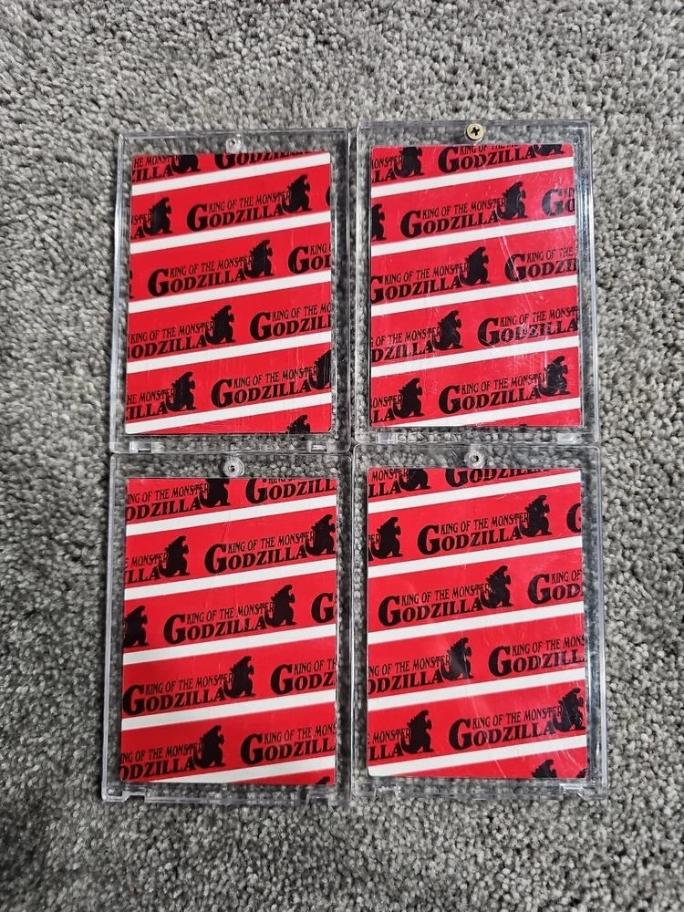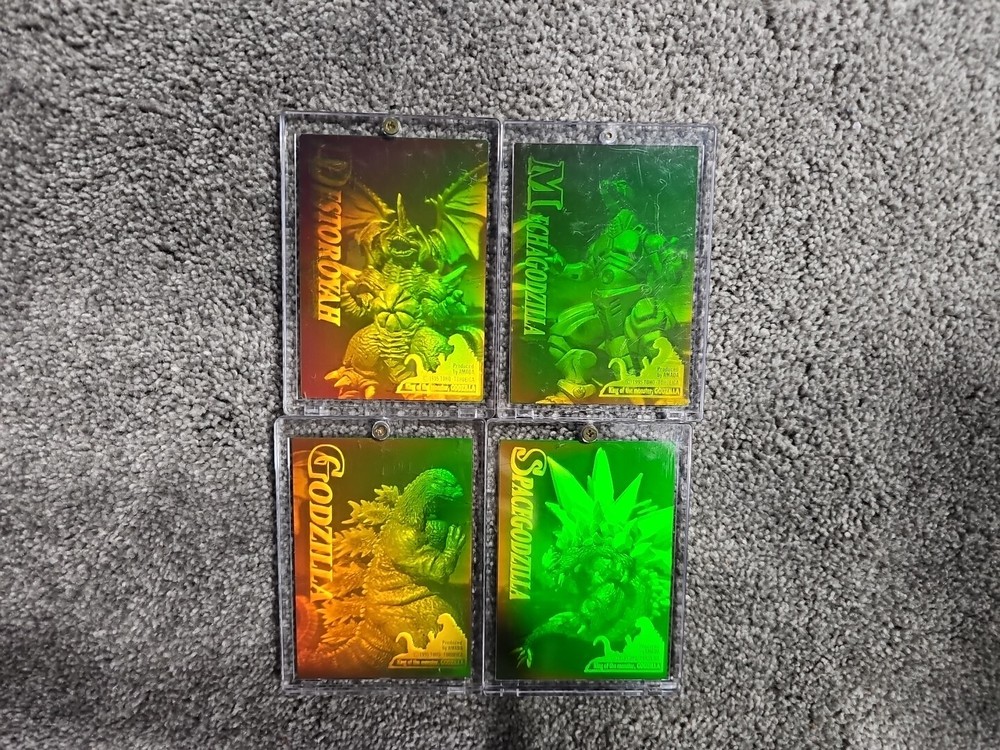 This 1995 Amada Godzilla - King Of Monsters Non-Sport Trading Card Set is a must-have for any Godzilla enthusiast. The set includes all four cards, each featuring a unique hologram and depicting scenes from the iconic film. These Ultra Rare cards are in Near Mint condition and have been carefully stored to ensure their preservation. The Year Manufactured aspect of this set is 1995, making it a true collectible for fans of the franchise. The Age Level is 4+, making it appropriate for all ages. The Franchise aspect is Godzilla, which is sure to appeal to fans of the classic monster series. Don't miss out on the chance to add this rare and unique set to your collection.