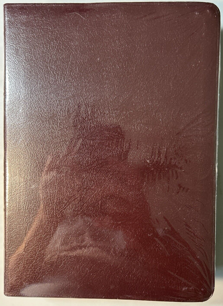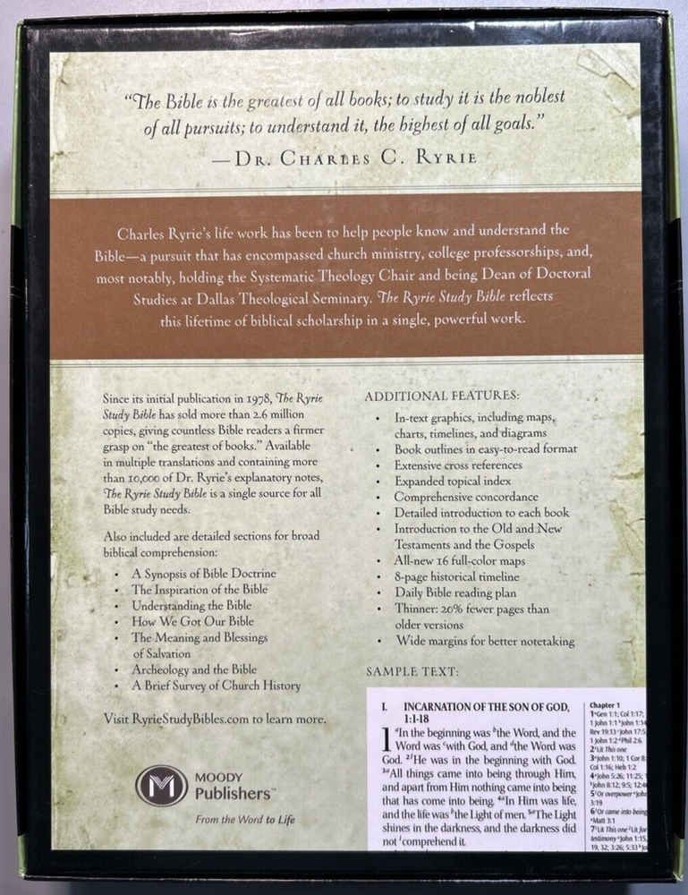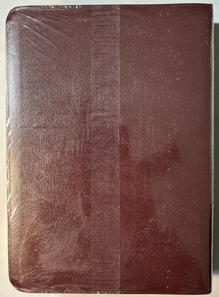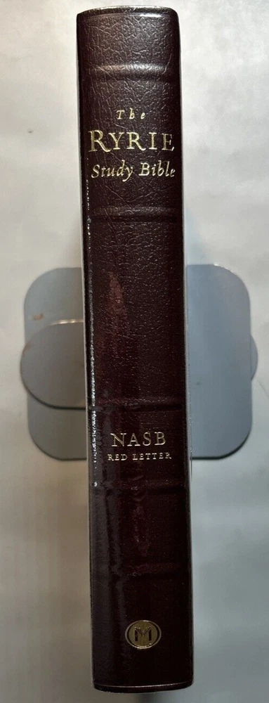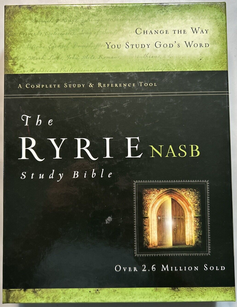1995 NASB Ryrie Study Bible Burgundy Bonded Leather Red Letter New In Box. Here are details on this Bible: 1. The print size is a 9 point type. 2. The cover size is 6 7/8" x 9 5/8" x 1 7/16". 3. Here are some of the features of this Bible: *Presentation page. *Ribbon marker. *Words of Christ in red. *Side column references *Page bottom notes *Harmony of the Gospels *Section of Bible Doctrines *Concordance *Color maps