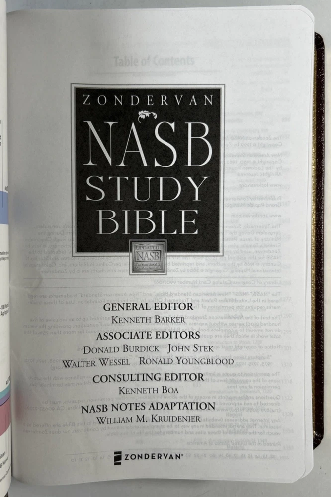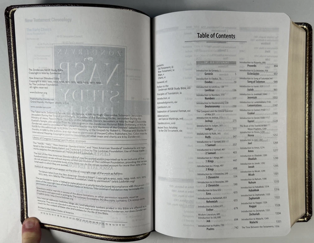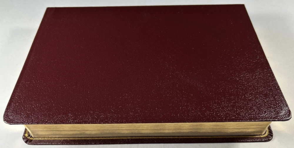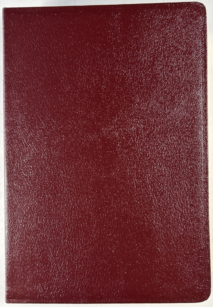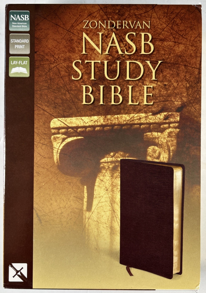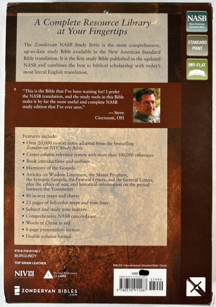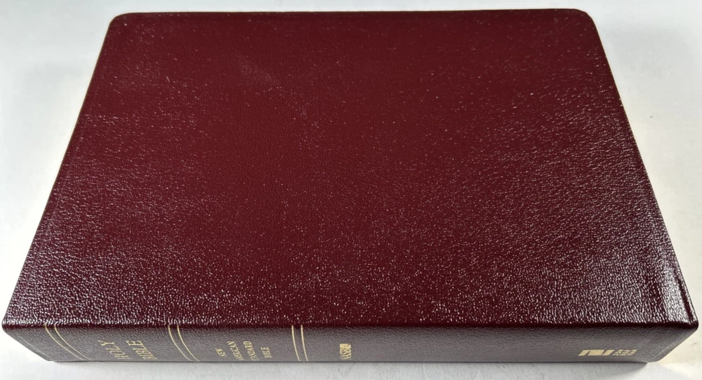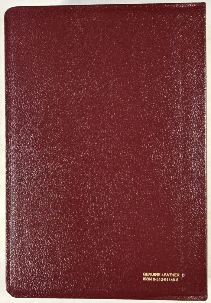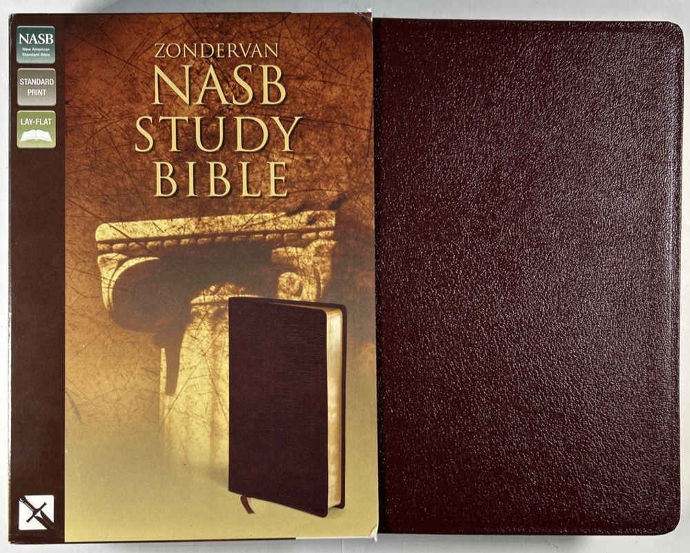 1995 NASB Study Bible Burgundy Top Grain Leather USA Print Red Letter Unused. Here are details on this Bible: 1. The print size is a 9 point type. 2. The cover size is 6 5/8" x 9 5/8" x 1 5/8". 3. Here are some of the features of this Bible: *USA Print. *Presentation page. *Original slipcase. *Chronology charts. *Book introductions and outlines. *Page bottom notes. *Center column references. *In text maps and charts. *Ribbon marker. *Words of Christ in red. *Index to Subjects. *Index to Notes. *Index to Maps. *Concordance. *Color maps. Listed as "Like New", here are details on the condition: Basically this Bible only shows wear on the slip case, otherwise it is in new condition.