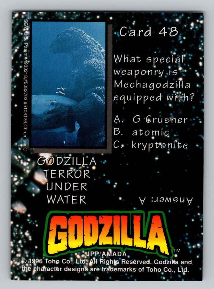This 1996 AMADA TOHO Godzilla TCG trading card has visible signs wear from age and handling. ------------------------ 1. Payment is due within 4 days of purchase. 2. Payment by PayPal E-Check will have to wait until it has cleared before shipping. This can take 5-7 for PayPal E-Check. 3. Please make any shipping requests prior to purchase. I will do my best to accommodate any shipping instructions. -------------------------- 1. Please view the shipping and payments tab for shipping rates outside the United States. 2. I will combine shipping on multiple item purchases! 3. Please make any shipping requests prior to purchase. I will do my best to accommodate any shipping instructions. -------------------------- All items are sold AS-IS in the description and as pictured. Stock photos are never used, only REAL photos! If you have any questions or concerns, please ask them before purchasing. All questions are answered as quickly as possible! Please read the listing carefully.