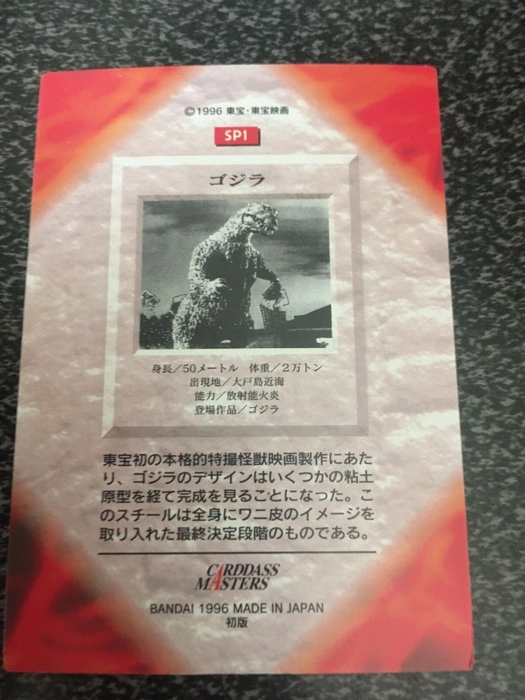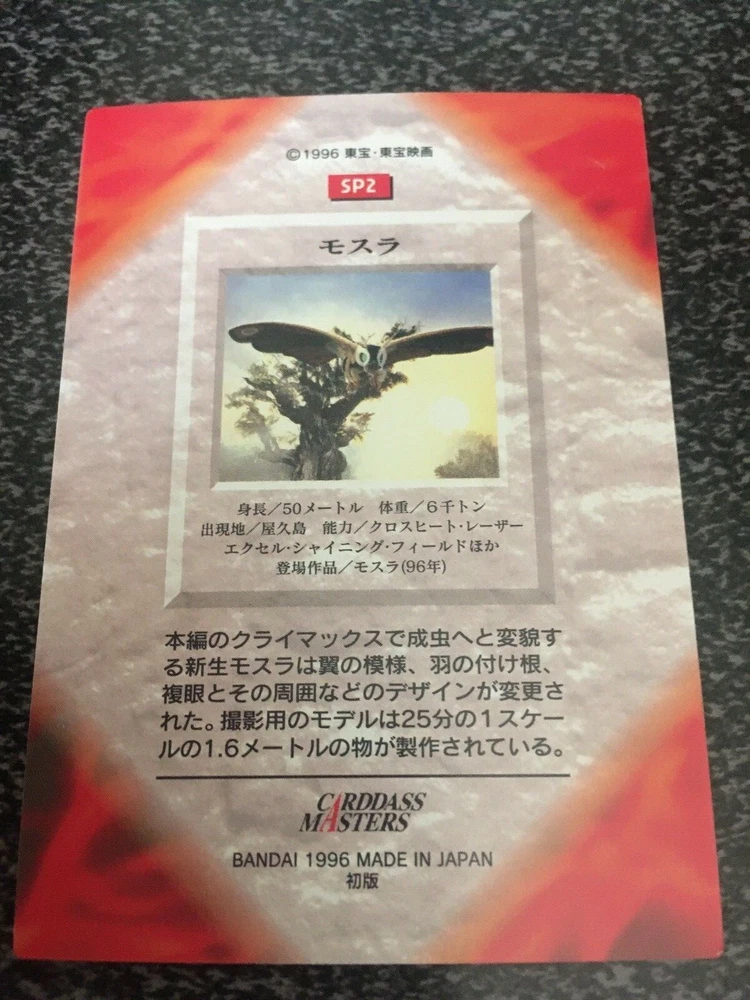THIS SALE IS FOR THE VERY RARE SUBSET CARDS FROM THE 1996 BANDAI CARDDASS MASTERS GODZILLA COLLECTION. THEY ARE SP1-GODZILLA AND SP2 MOTHRA. ON THE FRONT IS THE CREATURE AND ON THE BACK IS THE INFO IN JAPANESE. THERE 90 CARDS TO COMPLETE THE BASE SET AND THESE ARE THE 2 SUBSET CARDS. CARDS SENT IN A BUBBLE WRAPPED ENVELOPE, 1ST CLASS. I AM ALSO SELLING THE COMPLETE SET WITH THE SUBSET CARDS AND SPARES TO COMPLETE THE SET. PLEASE CHECK OUT MY OTHER GODZILLA AUCTIONS.