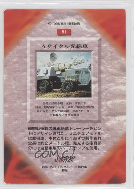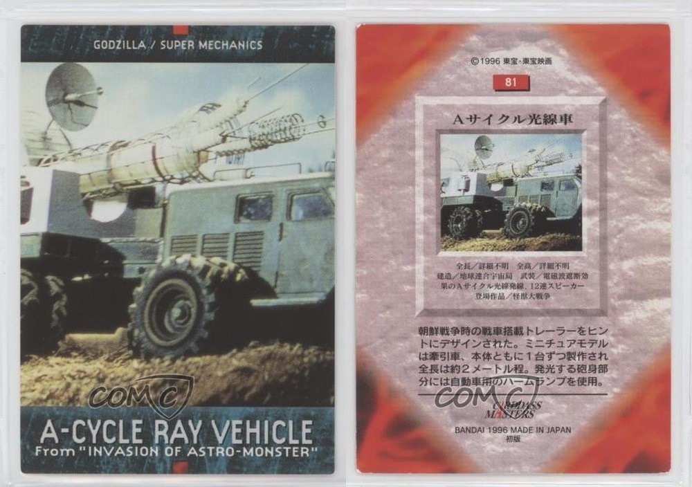 1996 Bandai Carddass Godzilla All of The Monsters - [Base] #81 A-Cycle Ray Vehicle COMC Item: 112966872 - Non-Sports Card Search for more: 1996 Bandai Carddass Godzilla All of The Monsters Search for more: 1996 Bandai Carddass Godzilla All of The Monsters - [Base] View all of our Listings Auctions Buy It Now About Us Located in the beautiful Pacific Northwest, COMC (Check Out My Cards) is the world's largest consignment service for trading card singles. More than 10,000 people have used our consignment service to list over 50 million trading cards. Find out how we can help you consign your items on eBay by contacting us through eBay messaging. COMC -- "The Safe & Easy Way to Buy & Sell" Raw Condition for Modern Cards Unless otherwise noted, raw modern cards are listed in Near Mint-Mint condition or better. A NM-MT card appears to be Mint at first glance, but upon closer inspection, may exhibit some of the following: minor print defects (e.g. roller marks, print line, dimple), minor scratches, slight edge wear, and slight corner wear. Centering is clearly visible in the images provided and does not factor into our condition assessment. Raw Condition for Vintage Cards Unless otherwise noted, raw vintage cards are listed in Excellent condition or better. An EX card may exhibit some of the following: minor rounding of corners, surface wear, print defects, light scratches, and slight edge wear/chipping. Centering is clearly visible in the images provided and does not factor into our condition assessment. Domestic Shipping Combined shipping for multiple items is available. To receive combined shipping, please ensure all desired items are in your eBay shopping cart before proceeding to checkout. eBay limits orders to 40 items per order. We automatically combine multiple orders placed on the same day. If you place multiple orders on the same day, please contact us to request a refund of applicable shipping costs. Signature confirmation may be required on invoices over $400. All cards are protected and shipped securely. International Shipping COMC offers eBay's International Shipping (EIS) for international orders under $2,500* (see country exceptions below). All duties and import fees are paid at checkout; in the rare event that there are additional import fees upon delivery, these are borne by the buyer. EIS packages route through a shipping hub in Erlanger, KY before shipping to their final destination. Please note that EIS does not allow for combined shipments. The shipping rates are determined by eBay and cannot be adjusted. *Maximum sale price exceptions: Colombia, Kuwait ($2,000); Taiwan ($1,539); Chile, Costa Rica, Guatemala, Honduras, Trinidad and Tobago ($1,000); Antigua and Barbuda, Aruba, Belize, Dominica, Grenada, Philippines, Saint Kitts and Nevis, Saint Lucia, Montserrat, Turks and Caicos Islands ($500); Dominican Republic, El Salvador ($200). Please request a shipping quote through eBay messaging for orders that exceed the maximum sale price supported by eBay's International Shipping. You will be responsible for all duties and import fees for international orders shipped outside the EIS. All cards are protected and shipped securely. Payment COMC does not accept offers on our cards through our eBay storefront. COMC utilizes eBay’s managed payments system. If you are experiencing difficulties making a payment, please contact eBay for assistance. Return Policy Returns are only accepted on the rare occasion the item is not as described. If you are making a return, please initiate the return process through eBay so a mailing label can be provided for you. Prior to listing, our expert team carefully assessed this item to represent it accurately. Please review the description and high-definition images prior to purchasing to ensure this item meets your satisfaction. We welcome you to contact us if you have further questions about this item. Trust and Integrity COMC carefully assesses each item consigned to us to prevent fraudulent items from entering the marketplace. If you believe an item offered on COMC may be fraudulent, please contact us with details so we can investigate the issue. Items we determine are outside our supported items policy may be removed. Last Modified: 6/11/2025 12:47:38 PM PDT