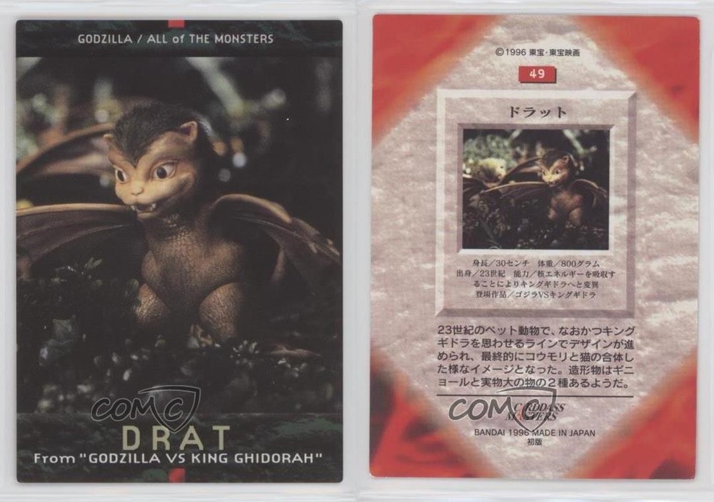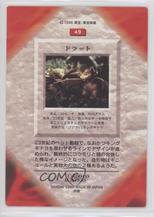 1996 Bandai Carddass Godzilla All of The Monsters - [Base] #49 Drat COMC Item: 112847655 - Non-Sports Card Search for more: 1996 Bandai Carddass Godzilla All of The Monsters Search for more: 1996 Bandai Carddass Godzilla All of The Monsters - [Base] View all of our Listings Auctions Buy It Now About Us Located in the beautiful Pacific Northwest, COMC (Check Out My Cards) is the world's largest consignment service for trading card singles. More than 10,000 people have used our consignment service to list over 50 million trading cards. Find out how we can help you consign your items on eBay by contacting us through eBay messaging. COMC -- "The Safe & Easy Way to Buy & Sell" Raw Condition for Modern Cards Unless otherwise noted, raw modern cards are listed in Near Mint-Mint condition or better. A NM-MT card appears to be Mint at first glance, but upon closer inspection, may exhibit some of the following: minor print defects (e.g. roller marks, print line, dimple), minor scratches, slight edge wear, and slight corner wear. Centering is clearly visible in the images provided and does not factor into our condition assessment. Raw Condition for Vintage Cards Unless otherwise noted, raw vintage cards are listed in Excellent condition or better. An EX card may exhibit some of the following: minor rounding of corners, surface wear, print defects, light scratches, and slight edge wear/chipping. Centering is clearly visible in the images provided and does not factor into our condition assessment. Domestic Shipping Combined shipping for multiple items is available. To receive combined shipping, please ensure all desired items are in your eBay shopping cart before proceeding to checkout. eBay limits orders to 40 items per order. We automatically combine multiple orders placed on the same day. If you place multiple orders on the same day, please contact us to request a refund of applicable shipping costs. Signature confirmation may be required on invoices over $400. All cards are protected and shipped securely. International Shipping COMC offers eBay's International Shipping (EIS) for international orders under $2,500* (see country exceptions below). All duties and import fees are paid at checkout; in the rare event that there are additional import fees upon delivery, these are borne by the buyer. EIS packages route through a shipping hub in Erlanger, KY before shipping to their final destination. Please note that EIS does not allow for combined shipments. The shipping rates are determined by eBay and cannot be adjusted. *Maximum sale price exceptions: Colombia, Kuwait ($2,000); Taiwan ($1,539); Chile, Costa Rica, Guatemala, Honduras, Trinidad and Tobago ($1,000); Antigua and Barbuda, Aruba, Belize, Dominica, Grenada, Philippines, Saint Kitts and Nevis, Saint Lucia, Montserrat, Turks and Caicos Islands ($500); Dominican Republic, El Salvador ($200). Please request a shipping quote through eBay messaging for orders that exceed the maximum sale price supported by eBay's International Shipping. You will be responsible for all duties and import fees for international orders shipped outside the EIS. All cards are protected and shipped securely. Payment COMC does not accept offers on our cards through our eBay storefront. COMC utilizes eBay’s managed payments system. If you are experiencing difficulties making a payment, please contact eBay for assistance. Return Policy Returns are only accepted on the rare occasion the item is not as described. If you are making a return, please initiate the return process through eBay so a mailing label can be provided for you. Prior to listing, our expert team carefully assessed this item to represent it accurately. Please review the description and high-definition images prior to purchasing to ensure this item meets your satisfaction. We welcome you to contact us if you have further questions about this item. Trust and Integrity COMC carefully assesses each item consigned to us to prevent fraudulent items from entering the marketplace. If you believe an item offered on COMC may be fraudulent, please contact us with details so we can investigate the issue. Items we determine are outside our supported items policy may be removed. Last Modified: 6/16/2025 2:30:02 PM PDT