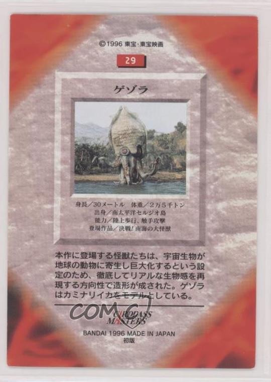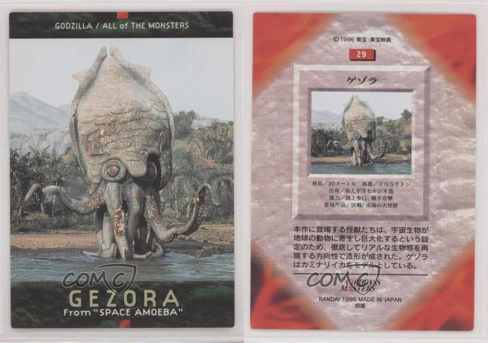 1996 Bandai Carddass Godzilla All of The Monsters - [Base] #29 Gezora COMC Item: 110569970 - Non-Sports Card - Featuring Gezora Search for more: 1996 Bandai Carddass Godzilla All of The Monsters Search for more: 1996 Bandai Carddass Godzilla All of The Monsters - [Base] View all of our Listings Auctions Buy It Now About Us Located in the beautiful Pacific Northwest, COMC (Check Out My Cards) is the world's largest consignment service for trading card singles. More than 10,000 people have used our consignment service to list over 50 million trading cards. Find out how we can help you consign your items on eBay by contacting us through eBay messaging. COMC -- "The Safe & Easy Way to Buy & Sell" Raw Condition for Modern Cards Unless otherwise noted, raw modern cards are listed in Near Mint-Mint condition or better. A NM-MT card appears to be Mint at first glance, but upon closer inspection, may exhibit some of the following: minor print defects (e.g. roller marks, print line, dimple), minor scratches, slight edge wear, and slight corner wear. Centering is clearly visible in the images provided and does not factor into our condition assessment. Raw Condition for Vintage Cards Unless otherwise noted, raw vintage cards are listed in Excellent condition or better. An EX card may exhibit some of the following: minor rounding of corners, surface wear, print defects, light scratches, and slight edge wear/chipping. Centering is clearly visible in the images provided and does not factor into our condition assessment. Domestic Shipping Combined shipping for multiple items is available. To receive combined shipping, please ensure all desired items are in your eBay shopping cart before proceeding to checkout. eBay limits orders to 40 items per order. We automatically combine multiple orders placed on the same day. If you place multiple orders on the same day, please contact us to request a refund of applicable shipping costs. Signature confirmation may be required on invoices over $400. All cards are protected and shipped securely. International Shipping COMC offers eBay's International Shipping (EIS) for international orders under $2,500* (see country exceptions below). All duties and import fees are paid at checkout; in the rare event that there are additional import fees upon delivery, these are borne by the buyer. EIS packages route through a shipping hub in Erlanger, KY before shipping to their final destination. Please note that EIS does not allow for combined shipments. The shipping rates are determined by eBay and cannot be adjusted. *Maximum sale price exceptions: Colombia, Kuwait ($2,000); Taiwan ($1,539); Chile, Costa Rica, Guatemala, Honduras, Trinidad and Tobago ($1,000); Antigua and Barbuda, Aruba, Belize, Dominica, Grenada, Philippines, Saint Kitts and Nevis, Saint Lucia, Montserrat, Turks and Caicos Islands ($500); Dominican Republic, El Salvador ($200). Please request a shipping quote through eBay messaging for orders that exceed the maximum sale price supported by eBay's International Shipping. You will be responsible for all duties and import fees for international orders shipped outside the EIS. All cards are protected and shipped securely. Payment COMC does not accept offers on our cards through our eBay storefront. COMC utilizes eBay’s managed payments system. If you are experiencing difficulties making a payment, please contact eBay for assistance. Return Policy Returns are only accepted on the rare occasion the item is not as described. If you are making a return, please initiate the return process through eBay so a mailing label can be provided for you. Prior to listing, our expert team carefully assessed this item to represent it accurately. Please review the description and high-definition images prior to purchasing to ensure this item meets your satisfaction. We welcome you to contact us if you have further questions about this item. Trust and Integrity COMC carefully assesses each item consigned to us to prevent fraudulent items from entering the marketplace. If you believe an item offered on COMC may be fraudulent, please contact us with details so we can investigate the issue. Items we determine are outside our supported items policy may be removed. Last Modified: 6/11/2025 2:15:06 PM PDT