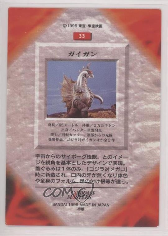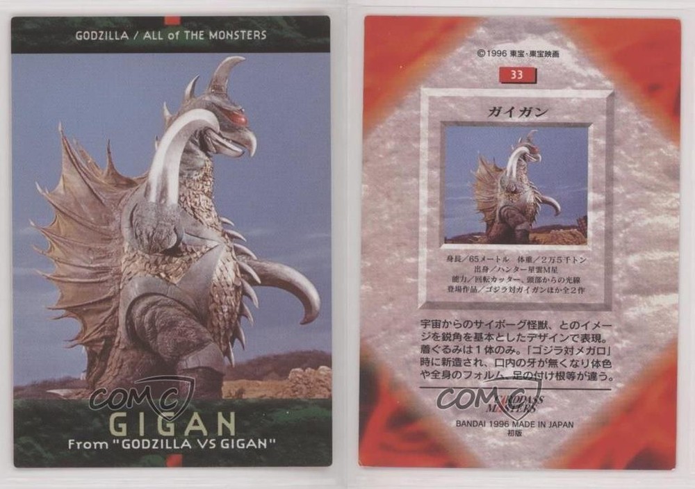 1996 Bandai Carddass Godzilla All of The Monsters - [Base] #33 Gigan COMC Item: 110569892 - Non-Sports Card - Featuring Gigan Search for more: 1996 Bandai Carddass Godzilla All of The Monsters Search for more: 1996 Bandai Carddass Godzilla All of The Monsters - [Base] View all of our Listings Auctions Buy It Now About Us Located in the beautiful Pacific Northwest, COMC (Check Out My Cards) is the world's largest consignment service for trading card singles. More than 10,000 people have used our consignment service to list over 50 million trading cards. Find out how we can help you consign your items on eBay by contacting us through eBay messaging. COMC -- "The Safe & Easy Way to Buy & Sell" Raw Condition for Modern Cards Unless otherwise noted, raw modern cards are listed in Near Mint-Mint condition or better. A NM-MT card appears to be Mint at first glance, but upon closer inspection, may exhibit some of the following: minor print defects (e.g. roller marks, print line, dimple), minor scratches, slight edge wear, and slight corner wear. Centering is clearly visible in the images provided and does not factor into our condition assessment. Raw Condition for Vintage Cards Unless otherwise noted, raw vintage cards are listed in Excellent condition or better. An EX card may exhibit some of the following: minor rounding of corners, surface wear, print defects, light scratches, and slight edge wear/chipping. Centering is clearly visible in the images provided and does not factor into our condition assessment. Domestic Shipping Combined shipping for multiple items is available. To receive combined shipping, please ensure all desired items are in your eBay shopping cart before proceeding to checkout. eBay limits orders to 40 items per order. We automatically combine multiple orders placed on the same day. If you place multiple orders on the same day, please contact us to request a refund of applicable shipping costs. Signature confirmation may be required on invoices over $400. All cards are protected and shipped securely. International Shipping COMC offers eBay's International Shipping (EIS) for international orders under $2,500* (see country exceptions below). All duties and import fees are paid at checkout; in the rare event that there are additional import fees upon delivery, these are borne by the buyer. EIS packages route through a shipping hub in Erlanger, KY before shipping to their final destination. Please note that EIS does not allow for combined shipments. The shipping rates are determined by eBay and cannot be adjusted. *Maximum sale price exceptions: Colombia, Kuwait ($2,000); Taiwan ($1,539); Chile, Costa Rica, Guatemala, Honduras, Trinidad and Tobago ($1,000); Antigua and Barbuda, Aruba, Belize, Dominica, Grenada, Philippines, Saint Kitts and Nevis, Saint Lucia, Montserrat, Turks and Caicos Islands ($500); Dominican Republic, El Salvador ($200). Please request a shipping quote through eBay messaging for orders that exceed the maximum sale price supported by eBay's International Shipping. You will be responsible for all duties and import fees for international orders shipped outside the EIS. All cards are protected and shipped securely. Payment COMC does not accept offers on our cards through our eBay storefront. COMC utilizes eBay’s managed payments system. If you are experiencing difficulties making a payment, please contact eBay for assistance. Return Policy Returns are only accepted on the rare occasion the item is not as described. If you are making a return, please initiate the return process through eBay so a mailing label can be provided for you. Prior to listing, our expert team carefully assessed this item to represent it accurately. Please review the description and high-definition images prior to purchasing to ensure this item meets your satisfaction. We welcome you to contact us if you have further questions about this item. Trust and Integrity COMC carefully assesses each item consigned to us to prevent fraudulent items from entering the marketplace. If you believe an item offered on COMC may be fraudulent, please contact us with details so we can investigate the issue. Items we determine are outside our supported items policy may be removed. Last Modified: 6/11/2025 2:14:59 PM PDT