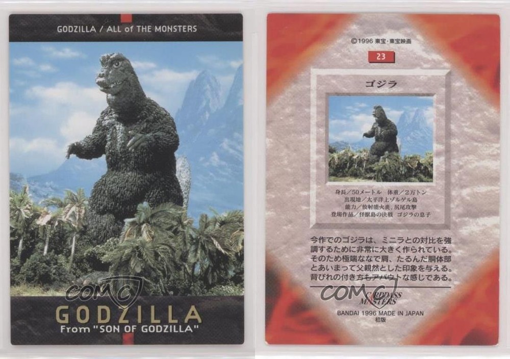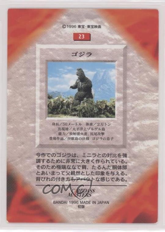 1996 Bandai Carddass Godzilla All of The Monsters - [Base] #23 Godzilla COMC Item: 110572917 - Non-Sports Card - Featuring Godzilla Search for more: 1996 Bandai Carddass Godzilla All of The Monsters Search for more: 1996 Bandai Carddass Godzilla All of The Monsters - [Base] View all of our Listings Auctions Buy It Now About Us Located in the beautiful Pacific Northwest, COMC (Check Out My Cards) is the world's largest consignment service for trading card singles. More than 10,000 people have used our consignment service to list over 50 million trading cards. Find out how we can help you consign your items on eBay by contacting us through eBay messaging. COMC -- "The Safe & Easy Way to Buy & Sell" Raw Condition for Modern Cards Unless otherwise noted, raw modern cards are listed in Near Mint-Mint condition or better. A NM-MT card appears to be Mint at first glance, but upon closer inspection, may exhibit some of the following: minor print defects (e.g. roller marks, print line, dimple), minor scratches, slight edge wear, and slight corner wear. Centering is clearly visible in the images provided and does not factor into our condition assessment. Raw Condition for Vintage Cards Unless otherwise noted, raw vintage cards are listed in Excellent condition or better. An EX card may exhibit some of the following: minor rounding of corners, surface wear, print defects, light scratches, and slight edge wear/chipping. Centering is clearly visible in the images provided and does not factor into our condition assessment. Domestic Shipping Combined shipping for multiple items is available. To receive combined shipping, please ensure all desired items are in your eBay shopping cart before proceeding to checkout. eBay limits orders to 40 items per order. We automatically combine multiple orders placed on the same day. If you place multiple orders on the same day, please contact us to request a refund of applicable shipping costs. Signature confirmation may be required on invoices over $400. All cards are protected and shipped securely. International Shipping COMC offers eBay's International Shipping (EIS) for international orders under $2,500* (see country exceptions below). All duties and import fees are paid at checkout; in the rare event that there are additional import fees upon delivery, these are borne by the buyer. EIS packages route through a shipping hub in Erlanger, KY before shipping to their final destination. Please note that EIS does not allow for combined shipments. The shipping rates are determined by eBay and cannot be adjusted. *Maximum sale price exceptions: Colombia, Kuwait ($2,000); Taiwan ($1,539); Chile, Costa Rica, Guatemala, Honduras, Trinidad and Tobago ($1,000); Antigua and Barbuda, Aruba, Belize, Dominica, Grenada, Philippines, Saint Kitts and Nevis, Saint Lucia, Montserrat, Turks and Caicos Islands ($500); Dominican Republic, El Salvador ($200). Please request a shipping quote through eBay messaging for orders that exceed the maximum sale price supported by eBay's International Shipping. You will be responsible for all duties and import fees for international orders shipped outside the EIS. All cards are protected and shipped securely. Payment COMC does not accept offers on our cards through our eBay storefront. COMC utilizes eBay’s managed payments system. If you are experiencing difficulties making a payment, please contact eBay for assistance. Return Policy Returns are only accepted on the rare occasion the item is not as described. If you are making a return, please initiate the return process through eBay so a mailing label can be provided for you. Prior to listing, our expert team carefully assessed this item to represent it accurately. Please review the description and high-definition images prior to purchasing to ensure this item meets your satisfaction. We welcome you to contact us if you have further questions about this item. Trust and Integrity COMC carefully assesses each item consigned to us to prevent fraudulent items from entering the marketplace. If you believe an item offered on COMC may be fraudulent, please contact us with details so we can investigate the issue. Items we determine are outside our supported items policy may be removed. Last Modified: 6/11/2025 2:25:56 PM PDT