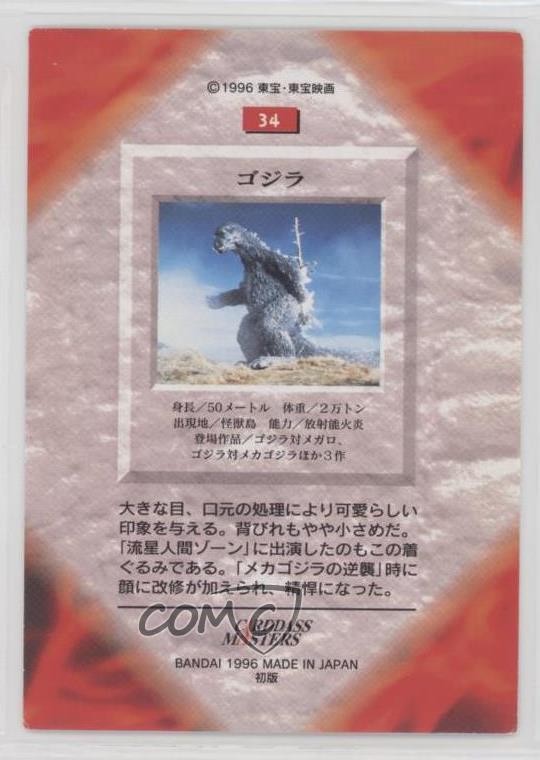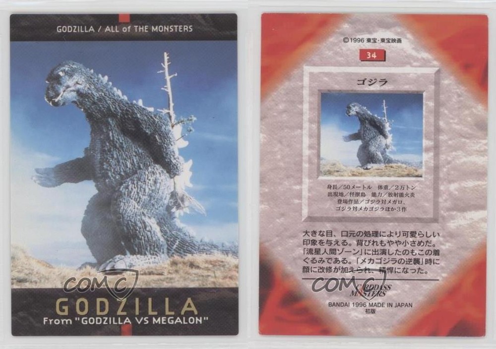 1996 Bandai Carddass Godzilla All of The Monsters - [Base] #34 Godzilla COMC Item: 110569017 - Non-Sports Card - Featuring Godzilla Search for more: 1996 Bandai Carddass Godzilla All of The Monsters Search for more: 1996 Bandai Carddass Godzilla All of The Monsters - [Base] View all of our Listings Auctions Buy It Now About Us Located in the beautiful Pacific Northwest, COMC (Check Out My Cards) is the world's largest consignment service for trading card singles. More than 10,000 people have used our consignment service to list over 50 million trading cards. Find out how we can help you consign your items on eBay by contacting us through eBay messaging. COMC -- "The Safe & Easy Way to Buy & Sell" Raw Condition for Modern Cards Unless otherwise noted, raw modern cards are listed in Near Mint-Mint condition or better. A NM-MT card appears to be Mint at first glance, but upon closer inspection, may exhibit some of the following: minor print defects (e.g. roller marks, print line, dimple), minor scratches, slight edge wear, and slight corner wear. Centering is clearly visible in the images provided and does not factor into our condition assessment. Raw Condition for Vintage Cards Unless otherwise noted, raw vintage cards are listed in Excellent condition or better. An EX card may exhibit some of the following: minor rounding of corners, surface wear, print defects, light scratches, and slight edge wear/chipping. Centering is clearly visible in the images provided and does not factor into our condition assessment. Domestic Shipping Combined shipping for multiple items is available. To receive combined shipping, please ensure all desired items are in your eBay shopping cart before proceeding to checkout. eBay limits orders to 40 items per order. We automatically combine multiple orders placed on the same day. If you place multiple orders on the same day, please contact us to request a refund of applicable shipping costs. Signature confirmation may be required on invoices over $400. All cards are protected and shipped securely. International Shipping COMC offers eBay's International Shipping (EIS) for international orders under $2,500* (see country exceptions below). All duties and import fees are paid at checkout; in the rare event that there are additional import fees upon delivery, these are borne by the buyer. EIS packages route through a shipping hub in Erlanger, KY before shipping to their final destination. Please note that EIS does not allow for combined shipments. The shipping rates are determined by eBay and cannot be adjusted. *Maximum sale price exceptions: Colombia, Kuwait ($2,000); Taiwan ($1,539); Chile, Costa Rica, Guatemala, Honduras, Trinidad and Tobago ($1,000); Antigua and Barbuda, Aruba, Belize, Dominica, Grenada, Philippines, Saint Kitts and Nevis, Saint Lucia, Montserrat, Turks and Caicos Islands ($500); Dominican Republic, El Salvador ($200). Please request a shipping quote through eBay messaging for orders that exceed the maximum sale price supported by eBay's International Shipping. You will be responsible for all duties and import fees for international orders shipped outside the EIS. All cards are protected and shipped securely. Payment COMC does not accept offers on our cards through our eBay storefront. COMC utilizes eBay’s managed payments system. If you are experiencing difficulties making a payment, please contact eBay for assistance. Return Policy Returns are only accepted on the rare occasion the item is not as described. If you are making a return, please initiate the return process through eBay so a mailing label can be provided for you. Prior to listing, our expert team carefully assessed this item to represent it accurately. Please review the description and high-definition images prior to purchasing to ensure this item meets your satisfaction. We welcome you to contact us if you have further questions about this item. Trust and Integrity COMC carefully assesses each item consigned to us to prevent fraudulent items from entering the marketplace. If you believe an item offered on COMC may be fraudulent, please contact us with details so we can investigate the issue. Items we determine are outside our supported items policy may be removed. Last Modified: 6/11/2025 2:08:30 PM PDT