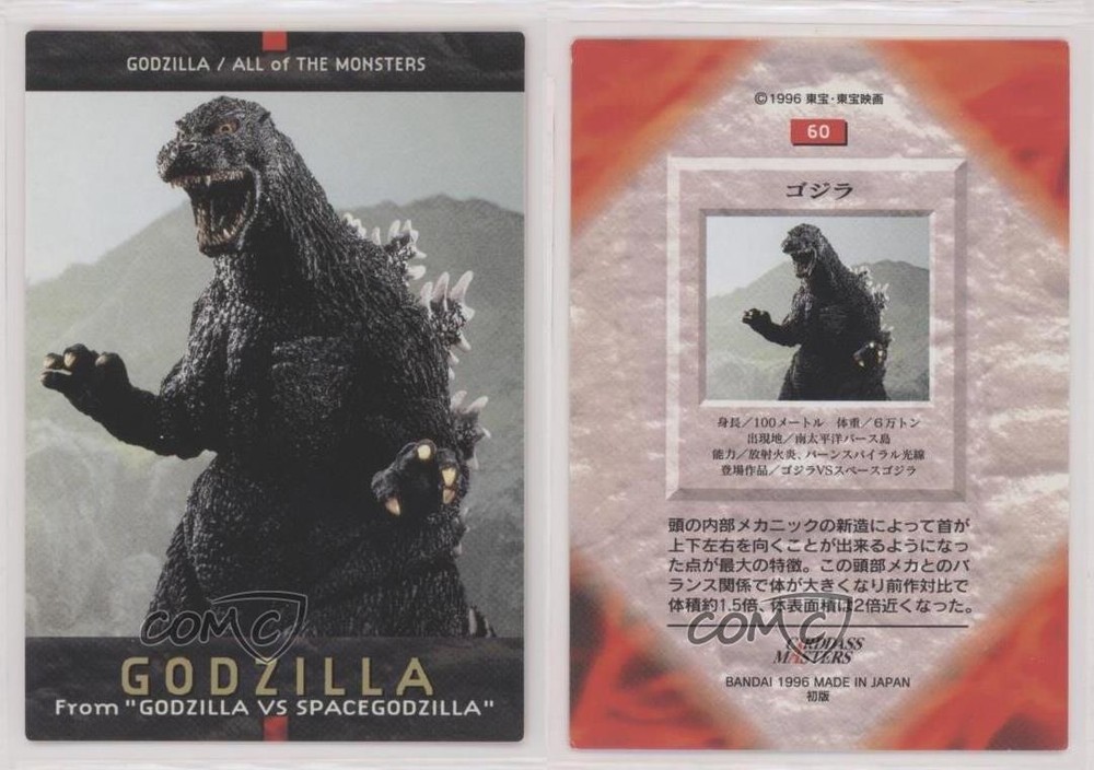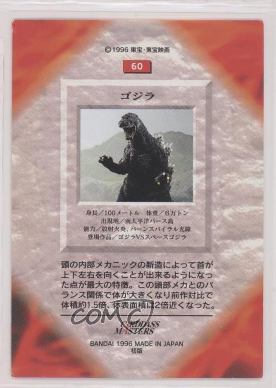 1996 Bandai Carddass Godzilla All of The Monsters - [Base] #60 Godzilla COMC Item: 110569789 - Non-Sports Card - Featuring Godzilla Search for more: 1996 Bandai Carddass Godzilla All of The Monsters Search for more: 1996 Bandai Carddass Godzilla All of The Monsters - [Base] View all of our Listings Auctions Buy It Now About Us Located in the beautiful Pacific Northwest, COMC (Check Out My Cards) is the world's largest consignment service for trading card singles. More than 10,000 people have used our consignment service to list over 50 million trading cards. Find out how we can help you consign your items on eBay by contacting us through eBay messaging. COMC -- "The Safe & Easy Way to Buy & Sell" Raw Condition for Modern Cards Unless otherwise noted, raw modern cards are listed in Near Mint-Mint condition or better. A NM-MT card appears to be Mint at first glance, but upon closer inspection, may exhibit some of the following: minor print defects (e.g. roller marks, print line, dimple), minor scratches, slight edge wear, and slight corner wear. Centering is clearly visible in the images provided and does not factor into our condition assessment. Raw Condition for Vintage Cards Unless otherwise noted, raw vintage cards are listed in Excellent condition or better. An EX card may exhibit some of the following: minor rounding of corners, surface wear, print defects, light scratches, and slight edge wear/chipping. Centering is clearly visible in the images provided and does not factor into our condition assessment. Domestic Shipping Combined shipping for multiple items is available. To receive combined shipping, please ensure all desired items are in your eBay shopping cart before proceeding to checkout. eBay limits orders to 40 items per order. We automatically combine multiple orders placed on the same day. If you place multiple orders on the same day, please contact us to request a refund of applicable shipping costs. Signature confirmation may be required on invoices over $400. All cards are protected and shipped securely. International Shipping COMC offers eBay's International Shipping (EIS) for international orders under $2,500* (see country exceptions below). All duties and import fees are paid at checkout; in the rare event that there are additional import fees upon delivery, these are borne by the buyer. EIS packages route through a shipping hub in Erlanger, KY before shipping to their final destination. Please note that EIS does not allow for combined shipments. The shipping rates are determined by eBay and cannot be adjusted. *Maximum sale price exceptions: Colombia, Kuwait ($2,000); Taiwan ($1,539); Chile, Costa Rica, Guatemala, Honduras, Trinidad and Tobago ($1,000); Antigua and Barbuda, Aruba, Belize, Dominica, Grenada, Philippines, Saint Kitts and Nevis, Saint Lucia, Montserrat, Turks and Caicos Islands ($500); Dominican Republic, El Salvador ($200). Please request a shipping quote through eBay messaging for orders that exceed the maximum sale price supported by eBay's International Shipping. You will be responsible for all duties and import fees for international orders shipped outside the EIS. All cards are protected and shipped securely. Payment COMC does not accept offers on our cards through our eBay storefront. COMC utilizes eBay’s managed payments system. If you are experiencing difficulties making a payment, please contact eBay for assistance. Return Policy Returns are only accepted on the rare occasion the item is not as described. If you are making a return, please initiate the return process through eBay so a mailing label can be provided for you. Prior to listing, our expert team carefully assessed this item to represent it accurately. Please review the description and high-definition images prior to purchasing to ensure this item meets your satisfaction. We welcome you to contact us if you have further questions about this item. Trust and Integrity COMC carefully assesses each item consigned to us to prevent fraudulent items from entering the marketplace. If you believe an item offered on COMC may be fraudulent, please contact us with details so we can investigate the issue. Items we determine are outside our supported items policy may be removed. Last Modified: 6/11/2025 2:14:29 PM PDT