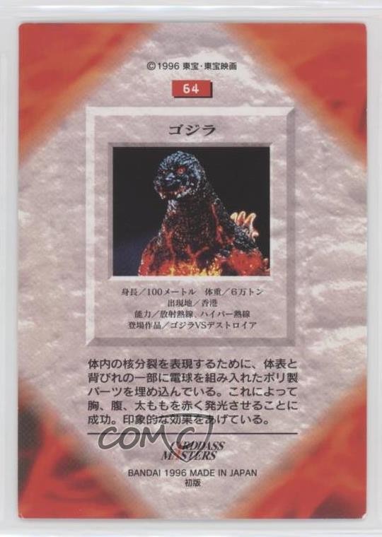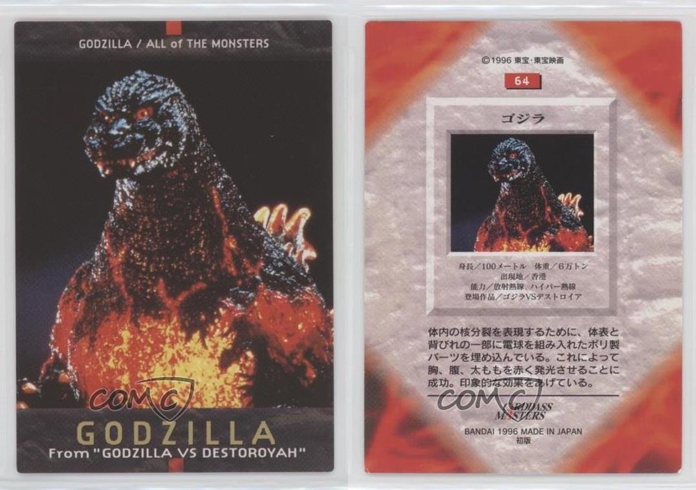 1996 Bandai Carddass Godzilla All of The Monsters - [Base] #64 Godzilla COMC Item: 111985721 - Non-Sports Card - Featuring Godzilla Search for more: 1996 Bandai Carddass Godzilla All of The Monsters Search for more: 1996 Bandai Carddass Godzilla All of The Monsters - [Base] View all of our Listings Auctions Buy It Now About Us Located in the beautiful Pacific Northwest, COMC (Check Out My Cards) is the world's largest consignment service for trading card singles. More than 10,000 people have used our consignment service to list over 50 million trading cards. Find out how we can help you consign your items on eBay by contacting us through eBay messaging. COMC -- "The Safe & Easy Way to Buy & Sell" Raw Condition for Modern Cards Unless otherwise noted, raw modern cards are listed in Near Mint-Mint condition or better. A NM-MT card appears to be Mint at first glance, but upon closer inspection, may exhibit some of the following: minor print defects (e.g. roller marks, print line, dimple), minor scratches, slight edge wear, and slight corner wear. Centering is clearly visible in the images provided and does not factor into our condition assessment. Raw Condition for Vintage Cards Unless otherwise noted, raw vintage cards are listed in Excellent condition or better. An EX card may exhibit some of the following: minor rounding of corners, surface wear, print defects, light scratches, and slight edge wear/chipping. Centering is clearly visible in the images provided and does not factor into our condition assessment. Domestic Shipping Combined shipping for multiple items is available. To receive combined shipping, please ensure all desired items are in your eBay shopping cart before proceeding to checkout. eBay limits orders to 40 items per order. We automatically combine multiple orders placed on the same day. If you place multiple orders on the same day, please contact us to request a refund of applicable shipping costs. Signature confirmation may be required on invoices over $400. All cards are protected and shipped securely. International Shipping COMC offers eBay's International Shipping (EIS) for international orders under $2,500* (see country exceptions below). All duties and import fees are paid at checkout; in the rare event that there are additional import fees upon delivery, these are borne by the buyer. EIS packages route through a shipping hub in Erlanger, KY before shipping to their final destination. Please note that EIS does not allow for combined shipments. The shipping rates are determined by eBay and cannot be adjusted. *Maximum sale price exceptions: Colombia, Kuwait ($2,000); Taiwan ($1,539); Chile, Costa Rica, Guatemala, Honduras, Trinidad and Tobago ($1,000); Antigua and Barbuda, Aruba, Belize, Dominica, Grenada, Philippines, Saint Kitts and Nevis, Saint Lucia, Montserrat, Turks and Caicos Islands ($500); Dominican Republic, El Salvador ($200). Please request a shipping quote through eBay messaging for orders that exceed the maximum sale price supported by eBay's International Shipping. You will be responsible for all duties and import fees for international orders shipped outside the EIS. All cards are protected and shipped securely. Payment COMC does not accept offers on our cards through our eBay storefront. COMC utilizes eBay’s managed payments system. If you are experiencing difficulties making a payment, please contact eBay for assistance. Return Policy Returns are only accepted on the rare occasion the item is not as described. If you are making a return, please initiate the return process through eBay so a mailing label can be provided for you. Prior to listing, our expert team carefully assessed this item to represent it accurately. Please review the description and high-definition images prior to purchasing to ensure this item meets your satisfaction. We welcome you to contact us if you have further questions about this item. Trust and Integrity COMC carefully assesses each item consigned to us to prevent fraudulent items from entering the marketplace. If you believe an item offered on COMC may be fraudulent, please contact us with details so we can investigate the issue. Items we determine are outside our supported items policy may be removed. Last Modified: 6/11/2025 2:25:50 PM PDT