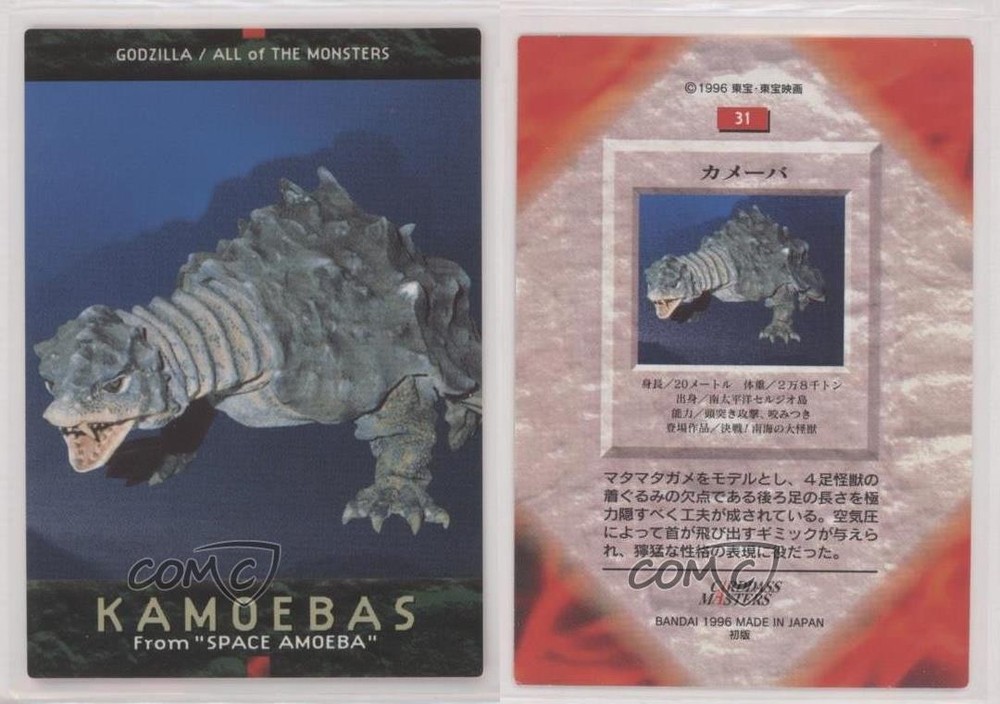 1996 Bandai Carddass Godzilla All of The Monsters - [Base] #31 Kamoebas COMC Item: 110569938 - Non-Sports Card - Featuring Kamoebas Search for more: 1996 Bandai Carddass Godzilla All of The Monsters Search for more: 1996 Bandai Carddass Godzilla All of The Monsters - [Base] View all of our Listings Auctions Buy It Now About Us Located in the beautiful Pacific Northwest, COMC (Check Out My Cards) is the world's largest consignment service for trading card singles. More than 10,000 people have used our consignment service to list over 50 million trading cards. Find out how we can help you consign your items on eBay by contacting us through eBay messaging. COMC -- "The Safe & Easy Way to Buy & Sell" Raw Condition for Modern Cards Unless otherwise noted, raw modern cards are listed in Near Mint-Mint condition or better. A NM-MT card appears to be Mint at first glance, but upon closer inspection, may exhibit some of the following: minor print defects (e.g. roller marks, print line, dimple), minor scratches, slight edge wear, and slight corner wear. Centering is clearly visible in the images provided and does not factor into our condition assessment. Raw Condition for Vintage Cards Unless otherwise noted, raw vintage cards are listed in Excellent condition or better. An EX card may exhibit some of the following: minor rounding of corners, surface wear, print defects, light scratches, and slight edge wear/chipping. Centering is clearly visible in the images provided and does not factor into our condition assessment. Domestic Shipping Combined shipping for multiple items is available. To receive combined shipping, please ensure all desired items are in your eBay shopping cart before proceeding to checkout. eBay limits orders to 40 items per order. We automatically combine multiple orders placed on the same day. If you place multiple orders on the same day, please contact us to request a refund of applicable shipping costs. Signature confirmation may be required on invoices over $400. All cards are protected and shipped securely. International Shipping COMC offers eBay's International Shipping (EIS) for international orders under $2,500* (see country exceptions below). All duties and import fees are paid at checkout; in the rare event that there are additional import fees upon delivery, these are borne by the buyer. EIS packages route through a shipping hub in Erlanger, KY before shipping to their final destination. Please note that EIS does not allow for combined shipments. The shipping rates are determined by eBay and cannot be adjusted. *Maximum sale price exceptions: Colombia, Kuwait ($2,000); Taiwan ($1,539); Chile, Costa Rica, Guatemala, Honduras, Trinidad and Tobago ($1,000); Antigua and Barbuda, Aruba, Belize, Dominica, Grenada, Philippines, Saint Kitts and Nevis, Saint Lucia, Montserrat, Turks and Caicos Islands ($500); Dominican Republic, El Salvador ($200). Please request a shipping quote through eBay messaging for orders that exceed the maximum sale price supported by eBay's International Shipping. You will be responsible for all duties and import fees for international orders shipped outside the EIS. All cards are protected and shipped securely. Payment COMC does not accept offers on our cards through our eBay storefront. COMC utilizes eBay’s managed payments system. If you are experiencing difficulties making a payment, please contact eBay for assistance. Return Policy Returns are only accepted on the rare occasion the item is not as described. If you are making a return, please initiate the return process through eBay so a mailing label can be provided for you. Prior to listing, our expert team carefully assessed this item to represent it accurately. Please review the description and high-definition images prior to purchasing to ensure this item meets your satisfaction. We welcome you to contact us if you have further questions about this item. Trust and Integrity COMC carefully assesses each item consigned to us to prevent fraudulent items from entering the marketplace. If you believe an item offered on COMC may be fraudulent, please contact us with details so we can investigate the issue. Items we determine are outside our supported items policy may be removed. Last Modified: 6/11/2025 2:15:03 PM PDT