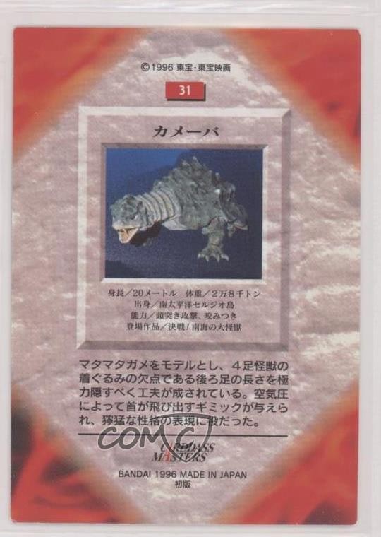 This vintage Bandai Carddass Godzilla card is a must-have for kaiju collectors! The artwork of Kamoebas is vibrant and detailed, capturing the monster’s unique look perfectly. The card’s condition is excellent, making it a great addition to any Godzilla or tokusatsu fan’s collection. COMC’s reliable service ensures a smooth purchase every time. Highly recommended for fans of classic monster cards!
