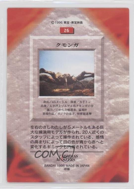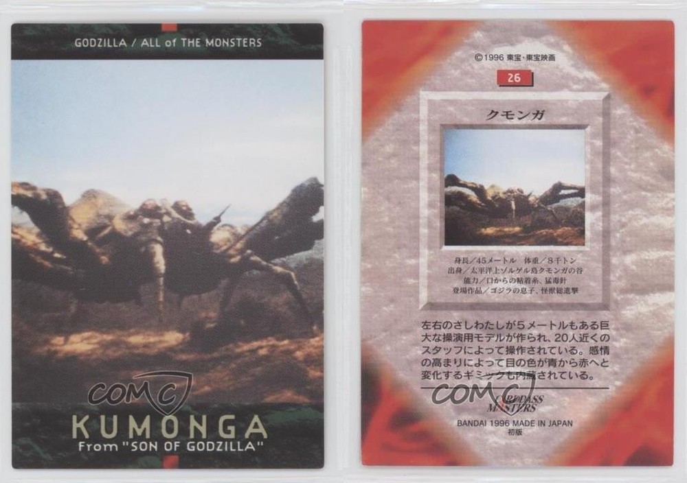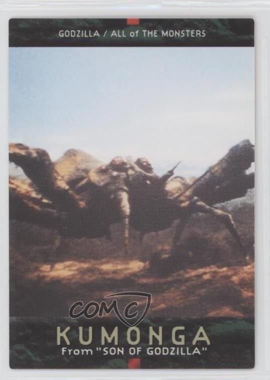 Just got this awesome Kumonga card from the 1996 Godzilla series! The artwork is super cool and brings back childhood memories. Arrived in perfect condition and looks amazing in my collection. Definitely recommend for any kaiju fan!