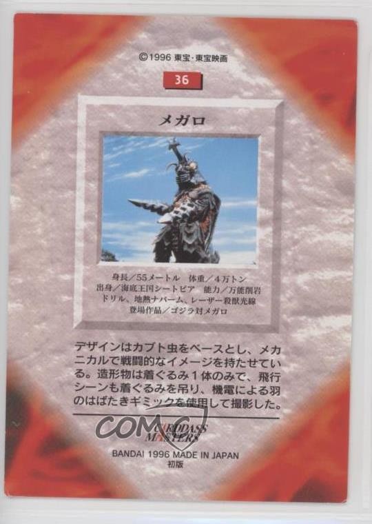 1996 Bandai Carddass Godzilla All of The Monsters - [Base] #36 Megalon COMC Item: 110569199 - Non-Sports Card - Featuring Megalon Search for more: 1996 Bandai Carddass Godzilla All of The Monsters Search for more: 1996 Bandai Carddass Godzilla All of The Monsters - [Base] View all of our Listings Auctions Buy It Now About Us Located in the beautiful Pacific Northwest, COMC (Check Out My Cards) is the world's largest consignment service for trading card singles. More than 10,000 people have used our consignment service to list over 50 million trading cards. Find out how we can help you consign your items on eBay by contacting us through eBay messaging. COMC -- "The Safe & Easy Way to Buy & Sell" Raw Condition for Modern Cards Unless otherwise noted, raw modern cards are listed in Near Mint-Mint condition or better. A NM-MT card appears to be Mint at first glance, but upon closer inspection, may exhibit some of the following: minor print defects (e.g. roller marks, print line, dimple), minor scratches, slight edge wear, and slight corner wear. Centering is clearly visible in the images provided and does not factor into our condition assessment. Raw Condition for Vintage Cards Unless otherwise noted, raw vintage cards are listed in Excellent condition or better. An EX card may exhibit some of the following: minor rounding of corners, surface wear, print defects, light scratches, and slight edge wear/chipping. Centering is clearly visible in the images provided and does not factor into our condition assessment. Domestic Shipping Combined shipping for multiple items is available. To receive combined shipping, please ensure all desired items are in your eBay shopping cart before proceeding to checkout. eBay limits orders to 40 items per order. We automatically combine multiple orders placed on the same day. If you place multiple orders on the same day, please contact us to request a refund of applicable shipping costs. Signature confirmation may be required on invoices over $400. All cards are protected and shipped securely. International Shipping COMC offers eBay's International Shipping (EIS) for international orders under $2,500* (see country exceptions below). All duties and import fees are paid at checkout; in the rare event that there are additional import fees upon delivery, these are borne by the buyer. EIS packages route through a shipping hub in Erlanger, KY before shipping to their final destination. Please note that EIS does not allow for combined shipments. The shipping rates are determined by eBay and cannot be adjusted. *Maximum sale price exceptions: Colombia, Kuwait ($2,000); Taiwan ($1,539); Chile, Costa Rica, Guatemala, Honduras, Trinidad and Tobago ($1,000); Antigua and Barbuda, Aruba, Belize, Dominica, Grenada, Philippines, Saint Kitts and Nevis, Saint Lucia, Montserrat, Turks and Caicos Islands ($500); Dominican Republic, El Salvador ($200). Please request a shipping quote through eBay messaging for orders that exceed the maximum sale price supported by eBay's International Shipping. You will be responsible for all duties and import fees for international orders shipped outside the EIS. All cards are protected and shipped securely. Payment COMC does not accept offers on our cards through our eBay storefront. COMC utilizes eBay’s managed payments system. If you are experiencing difficulties making a payment, please contact eBay for assistance. Return Policy Returns are only accepted on the rare occasion the item is not as described. If you are making a return, please initiate the return process through eBay so a mailing label can be provided for you. Prior to listing, our expert team carefully assessed this item to represent it accurately. Please review the description and high-definition images prior to purchasing to ensure this item meets your satisfaction. We welcome you to contact us if you have further questions about this item. Trust and Integrity COMC carefully assesses each item consigned to us to prevent fraudulent items from entering the marketplace. If you believe an item offered on COMC may be fraudulent, please contact us with details so we can investigate the issue. Items we determine are outside our supported items policy may be removed. Last Modified: 6/11/2025 2:08:54 PM PDT