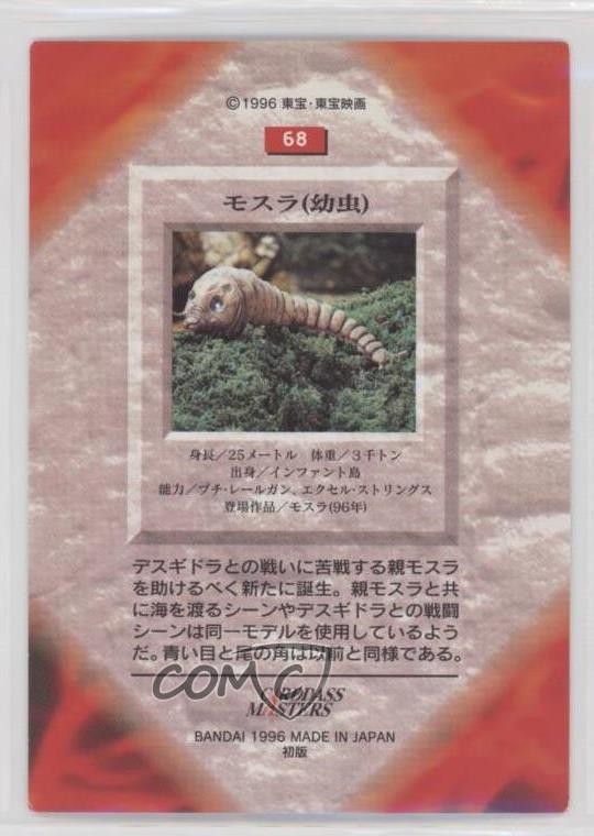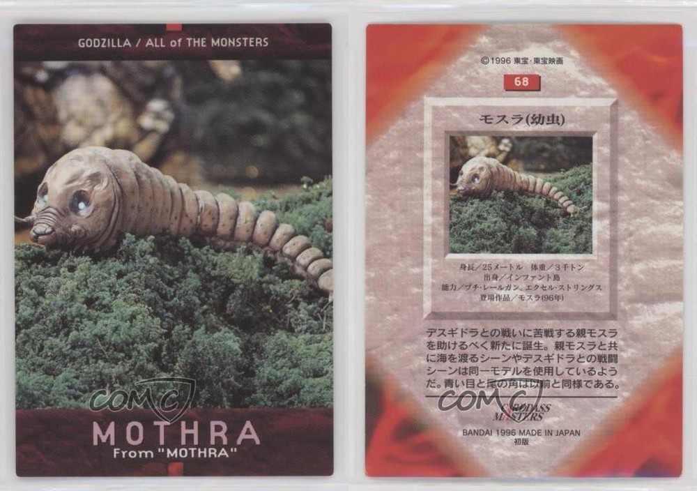 1996 Bandai Carddass Godzilla All of The Monsters - [Base] #68 Mothra COMC Item: 112966827 - Non-Sports Card - Featuring Mothra Search for more: 1996 Bandai Carddass Godzilla All of The Monsters Search for more: 1996 Bandai Carddass Godzilla All of The Monsters - [Base] View all of our Listings Auctions Buy It Now About Us Located in the beautiful Pacific Northwest, COMC (Check Out My Cards) is the world's largest consignment service for trading card singles. More than 10,000 people have used our consignment service to list over 50 million trading cards. Find out how we can help you consign your items on eBay by contacting us through eBay messaging. COMC -- "The Safe & Easy Way to Buy & Sell" Raw Condition for Modern Cards Unless otherwise noted, raw modern cards are listed in Near Mint-Mint condition or better. A NM-MT card appears to be Mint at first glance, but upon closer inspection, may exhibit some of the following: minor print defects (e.g. roller marks, print line, dimple), minor scratches, slight edge wear, and slight corner wear. Centering is clearly visible in the images provided and does not factor into our condition assessment. Raw Condition for Vintage Cards Unless otherwise noted, raw vintage cards are listed in Excellent condition or better. An EX card may exhibit some of the following: minor rounding of corners, surface wear, print defects, light scratches, and slight edge wear/chipping. Centering is clearly visible in the images provided and does not factor into our condition assessment. Domestic Shipping Combined shipping for multiple items is available. To receive combined shipping, please ensure all desired items are in your eBay shopping cart before proceeding to checkout. eBay limits orders to 40 items per order. We automatically combine multiple orders placed on the same day. If you place multiple orders on the same day, please contact us to request a refund of applicable shipping costs. Signature confirmation may be required on invoices over $400. All cards are protected and shipped securely. International Shipping COMC offers eBay's International Shipping (EIS) for international orders under $2,500* (see country exceptions below). All duties and import fees are paid at checkout; in the rare event that there are additional import fees upon delivery, these are borne by the buyer. EIS packages route through a shipping hub in Erlanger, KY before shipping to their final destination. Please note that EIS does not allow for combined shipments. The shipping rates are determined by eBay and cannot be adjusted. *Maximum sale price exceptions: Colombia, Kuwait ($2,000); Taiwan ($1,539); Chile, Costa Rica, Guatemala, Honduras, Trinidad and Tobago ($1,000); Antigua and Barbuda, Aruba, Belize, Dominica, Grenada, Philippines, Saint Kitts and Nevis, Saint Lucia, Montserrat, Turks and Caicos Islands ($500); Dominican Republic, El Salvador ($200). Please request a shipping quote through eBay messaging for orders that exceed the maximum sale price supported by eBay's International Shipping. You will be responsible for all duties and import fees for international orders shipped outside the EIS. All cards are protected and shipped securely. Payment COMC does not accept offers on our cards through our eBay storefront. COMC utilizes eBay’s managed payments system. If you are experiencing difficulties making a payment, please contact eBay for assistance. Return Policy Returns are only accepted on the rare occasion the item is not as described. If you are making a return, please initiate the return process through eBay so a mailing label can be provided for you. Prior to listing, our expert team carefully assessed this item to represent it accurately. Please review the description and high-definition images prior to purchasing to ensure this item meets your satisfaction. We welcome you to contact us if you have further questions about this item. Trust and Integrity COMC carefully assesses each item consigned to us to prevent fraudulent items from entering the marketplace. If you believe an item offered on COMC may be fraudulent, please contact us with details so we can investigate the issue. Items we determine are outside our supported items policy may be removed. Last Modified: 6/11/2025 12:45:46 PM PDT