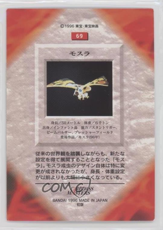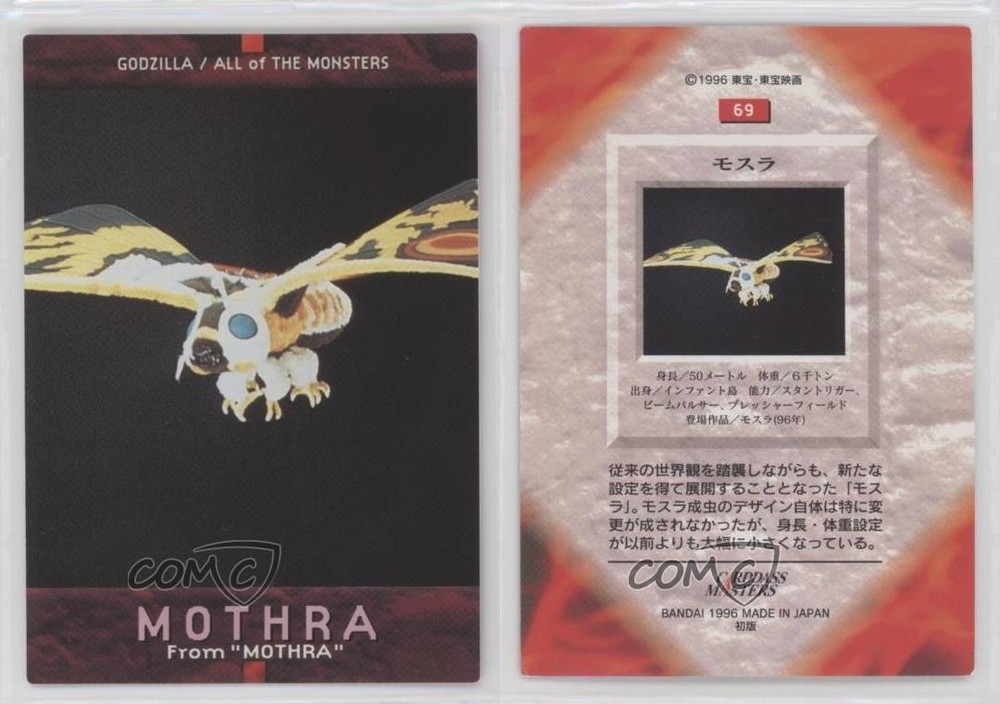 1996 Bandai Carddass Godzilla All of The Monsters - [Base] #69 Mothra COMC Item: 119664482 - Non-Sports Card - Featuring Mothra Search for more: 1996 Bandai Carddass Godzilla All of The Monsters Search for more: 1996 Bandai Carddass Godzilla All of The Monsters - [Base] View all of our Listings Auctions Buy It Now About Us Located in the beautiful Pacific Northwest, COMC (Check Out My Cards) is the world's largest consignment service for trading card singles. More than 10,000 people have used our consignment service to list over 50 million trading cards. Find out how we can help you consign your items on eBay by contacting us through eBay messaging. COMC -- "The Safe & Easy Way to Buy & Sell" Raw Condition for Modern Cards Unless otherwise noted, raw modern cards are listed in Near Mint-Mint condition or better. A NM-MT card appears to be Mint at first glance, but upon closer inspection, may exhibit some of the following: minor print defects (e.g. roller marks, print line, dimple), minor scratches, slight edge wear, and slight corner wear. Centering is clearly visible in the images provided and does not factor into our condition assessment. Raw Condition for Vintage Cards Unless otherwise noted, raw vintage cards are listed in Excellent condition or better. An EX card may exhibit some of the following: minor rounding of corners, surface wear, print defects, light scratches, and slight edge wear/chipping. Centering is clearly visible in the images provided and does not factor into our condition assessment. Domestic Shipping Combined shipping for multiple items is available. To receive combined shipping, please ensure all desired items are in your eBay shopping cart before proceeding to checkout. eBay limits orders to 40 items per order. We automatically combine multiple orders placed on the same day. If you place multiple orders on the same day, please contact us to request a refund of applicable shipping costs. Signature confirmation may be required on invoices over $400. All cards are protected and shipped securely. International Shipping COMC offers eBay's International Shipping (EIS) for international orders under $2,500* (see country exceptions below). All duties and import fees are paid at checkout; in the rare event that there are additional import fees upon delivery, these are borne by the buyer. EIS packages route through a shipping hub in Erlanger, KY before shipping to their final destination. Please note that EIS does not allow for combined shipments. The shipping rates are determined by eBay and cannot be adjusted. *Maximum sale price exceptions: Colombia, Kuwait ($2,000); Taiwan ($1,539); Chile, Costa Rica, Guatemala, Honduras, Trinidad and Tobago ($1,000); Antigua and Barbuda, Aruba, Belize, Dominica, Grenada, Philippines, Saint Kitts and Nevis, Saint Lucia, Montserrat, Turks and Caicos Islands ($500); Dominican Republic, El Salvador ($200). Please request a shipping quote through eBay messaging for orders that exceed the maximum sale price supported by eBay's International Shipping. You will be responsible for all duties and import fees for international orders shipped outside the EIS. All cards are protected and shipped securely. Payment COMC does not accept offers on our cards through our eBay storefront. COMC utilizes eBay’s managed payments system. If you are experiencing difficulties making a payment, please contact eBay for assistance. Return Policy Returns are only accepted on the rare occasion the item is not as described. If you are making a return, please initiate the return process through eBay so a mailing label can be provided for you. Prior to listing, our expert team carefully assessed this item to represent it accurately. Please review the description and high-definition images prior to purchasing to ensure this item meets your satisfaction. We welcome you to contact us if you have further questions about this item. Trust and Integrity COMC carefully assesses each item consigned to us to prevent fraudulent items from entering the marketplace. If you believe an item offered on COMC may be fraudulent, please contact us with details so we can investigate the issue. Items we determine are outside our supported items policy may be removed. Last Modified: 6/1/2025 7:30:30 AM PDT