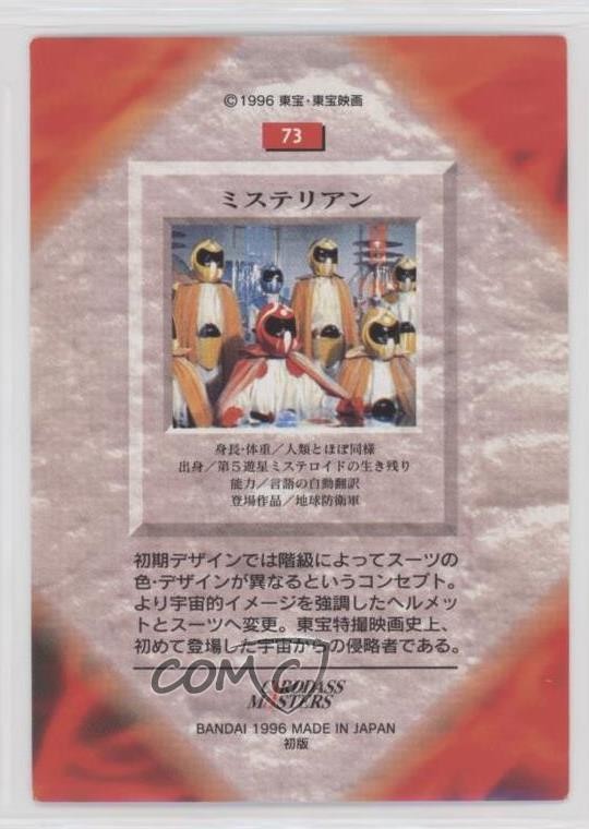 This vintage 1996 Bandai Carddass Godzilla card featuring Mysterian is a must-have for kaiju collectors! The artwork is vibrant, capturing the classic monster movie vibe perfectly. The card condition looks excellent, making it a great addition to any Godzilla or tokusatsu fan’s collection. COMC’s reliable service ensures a smooth purchase—highly recommended for fans of retro Japanese monster cards!