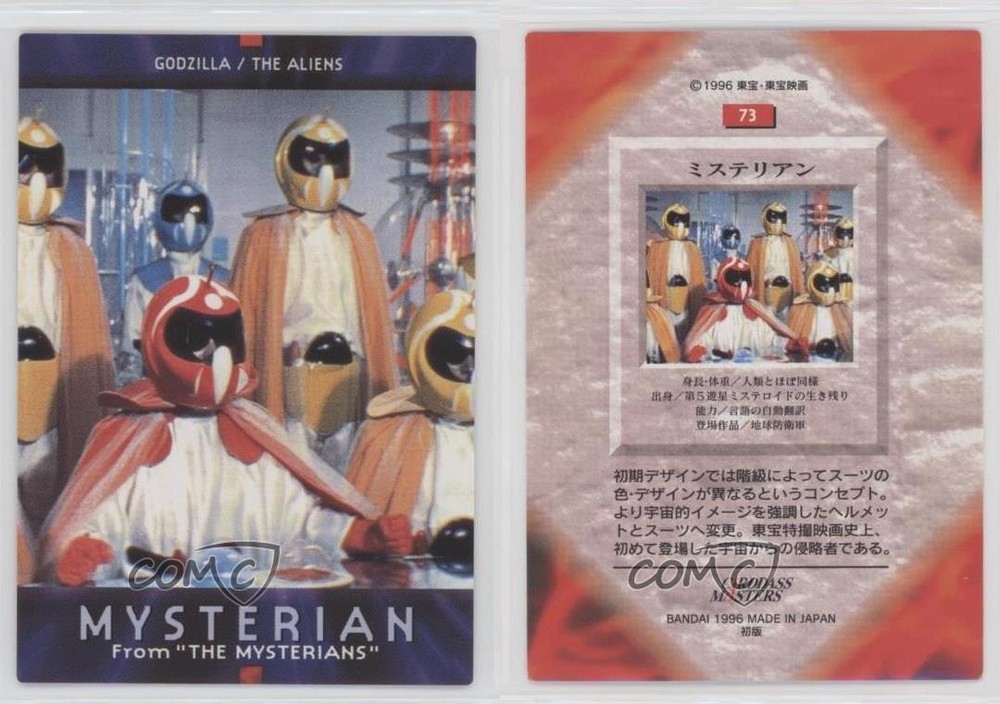 1996 Bandai Carddass Godzilla All of The Monsters - [Base] #73 Mysterian COMC Item: 119835509 - Non-Sports Card Search for more: 1996 Bandai Carddass Godzilla All of The Monsters Search for more: 1996 Bandai Carddass Godzilla All of The Monsters - [Base] View all of our Listings Auctions Buy It Now About Us Located in the beautiful Pacific Northwest, COMC (Check Out My Cards) is the world's largest consignment service for trading card singles. More than 10,000 people have used our consignment service to list over 50 million trading cards. Find out how we can help you consign your items on eBay by contacting us through eBay messaging. COMC -- "The Safe & Easy Way to Buy & Sell" Raw Condition for Modern Cards Unless otherwise noted, raw modern cards are listed in Near Mint-Mint condition or better. A NM-MT card appears to be Mint at first glance, but upon closer inspection, may exhibit some of the following: minor print defects (e.g. roller marks, print line, dimple), minor scratches, slight edge wear, and slight corner wear. Centering is clearly visible in the images provided and does not factor into our condition assessment. Raw Condition for Vintage Cards Unless otherwise noted, raw vintage cards are listed in Excellent condition or better. An EX card may exhibit some of the following: minor rounding of corners, surface wear, print defects, light scratches, and slight edge wear/chipping. Centering is clearly visible in the images provided and does not factor into our condition assessment. Domestic Shipping Combined shipping for multiple items is available. To receive combined shipping, please ensure all desired items are in your eBay shopping cart before proceeding to checkout. eBay limits orders to 40 items per order. We automatically combine multiple orders placed on the same day. If you place multiple orders on the same day, please contact us to request a refund of applicable shipping costs. Signature confirmation may be required on invoices over $400. All cards are protected and shipped securely. International Shipping COMC offers eBay's International Shipping (EIS) for international orders under $2,500* (see country exceptions below). All duties and import fees are paid at checkout; in the rare event that there are additional import fees upon delivery, these are borne by the buyer. EIS packages route through a shipping hub in Erlanger, KY before shipping to their final destination. Please note that EIS does not allow for combined shipments. The shipping rates are determined by eBay and cannot be adjusted. *Maximum sale price exceptions: Colombia, Kuwait ($2,000); Taiwan ($1,539); Chile, Costa Rica, Guatemala, Honduras, Trinidad and Tobago ($1,000); Antigua and Barbuda, Aruba, Belize, Dominica, Grenada, Philippines, Saint Kitts and Nevis, Saint Lucia, Montserrat, Turks and Caicos Islands ($500); Dominican Republic, El Salvador ($200). Please request a shipping quote through eBay messaging for orders that exceed the maximum sale price supported by eBay's International Shipping. You will be responsible for all duties and import fees for international orders shipped outside the EIS. All cards are protected and shipped securely. Payment COMC does not accept offers on our cards through our eBay storefront. COMC utilizes eBay’s managed payments system. If you are experiencing difficulties making a payment, please contact eBay for assistance. Return Policy Returns are only accepted on the rare occasion the item is not as described. If you are making a return, please initiate the return process through eBay so a mailing label can be provided for you. Prior to listing, our expert team carefully assessed this item to represent it accurately. Please review the description and high-definition images prior to purchasing to ensure this item meets your satisfaction. We welcome you to contact us if you have further questions about this item. Trust and Integrity COMC carefully assesses each item consigned to us to prevent fraudulent items from entering the marketplace. If you believe an item offered on COMC may be fraudulent, please contact us with details so we can investigate the issue. Items we determine are outside our supported items policy may be removed. Last Modified: 6/1/2025 1:19:20 PM PDT