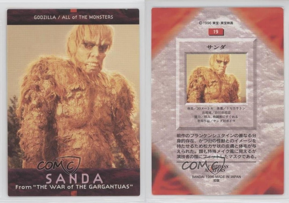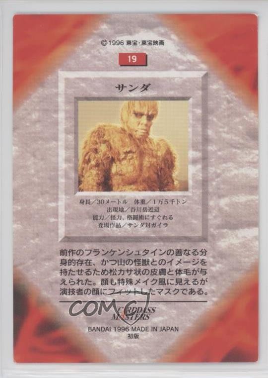 1996 Bandai Carddass Godzilla All of The Monsters - [Base] #19 Sanda COMC Item: 119422053 - Non-Sports Card - Featuring Sanda Search for more: 1996 Bandai Carddass Godzilla All of The Monsters Search for more: 1996 Bandai Carddass Godzilla All of The Monsters - [Base] View all of our Listings Auctions Buy It Now About Us Located in the beautiful Pacific Northwest, COMC (Check Out My Cards) is the world's largest consignment service for trading card singles. More than 10,000 people have used our consignment service to list over 50 million trading cards. Find out how we can help you consign your items on eBay by contacting us through eBay messaging. COMC -- "The Safe & Easy Way to Buy & Sell" Raw Condition for Modern Cards Unless otherwise noted, raw modern cards are listed in Near Mint-Mint condition or better. A NM-MT card appears to be Mint at first glance, but upon closer inspection, may exhibit some of the following: minor print defects (e.g. roller marks, print line, dimple), minor scratches, slight edge wear, and slight corner wear. Centering is clearly visible in the images provided and does not factor into our condition assessment. Raw Condition for Vintage Cards Unless otherwise noted, raw vintage cards are listed in Excellent condition or better. An EX card may exhibit some of the following: minor rounding of corners, surface wear, print defects, light scratches, and slight edge wear/chipping. Centering is clearly visible in the images provided and does not factor into our condition assessment. Domestic Shipping Combined shipping for multiple items is available. To receive combined shipping, please ensure all desired items are in your eBay shopping cart before proceeding to checkout. eBay limits orders to 40 items per order. We automatically combine multiple orders placed on the same day. If you place multiple orders on the same day, please contact us to request a refund of applicable shipping costs. Signature confirmation may be required on invoices over $400. All cards are protected and shipped securely. International Shipping COMC offers eBay's International Shipping (EIS) for international orders under $2,500* (see country exceptions below). All duties and import fees are paid at checkout; in the rare event that there are additional import fees upon delivery, these are borne by the buyer. EIS packages route through a shipping hub in Erlanger, KY before shipping to their final destination. Please note that EIS does not allow for combined shipments. The shipping rates are determined by eBay and cannot be adjusted. *Maximum sale price exceptions: Colombia, Kuwait ($2,000); Taiwan ($1,539); Chile, Costa Rica, Guatemala, Honduras, Trinidad and Tobago ($1,000); Antigua and Barbuda, Aruba, Belize, Dominica, Grenada, Philippines, Saint Kitts and Nevis, Saint Lucia, Montserrat, Turks and Caicos Islands ($500); Dominican Republic, El Salvador ($200). Please request a shipping quote through eBay messaging for orders that exceed the maximum sale price supported by eBay's International Shipping. You will be responsible for all duties and import fees for international orders shipped outside the EIS. All cards are protected and shipped securely. Payment COMC does not accept offers on our cards through our eBay storefront. COMC utilizes eBay’s managed payments system. If you are experiencing difficulties making a payment, please contact eBay for assistance. Return Policy Returns are only accepted on the rare occasion the item is not as described. If you are making a return, please initiate the return process through eBay so a mailing label can be provided for you. Prior to listing, our expert team carefully assessed this item to represent it accurately. Please review the description and high-definition images prior to purchasing to ensure this item meets your satisfaction. We welcome you to contact us if you have further questions about this item. Trust and Integrity COMC carefully assesses each item consigned to us to prevent fraudulent items from entering the marketplace. If you believe an item offered on COMC may be fraudulent, please contact us with details so we can investigate the issue. Items we determine are outside our supported items policy may be removed. Last Modified: 5/31/2025 10:46:41 PM PDT