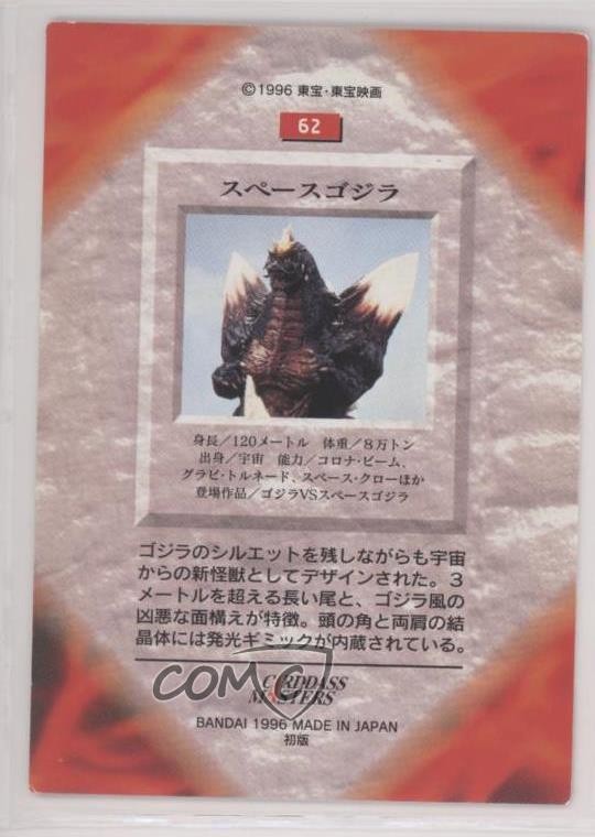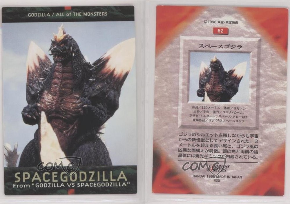 1996 Bandai Carddass Godzilla All of The Monsters - [Base] #62 SpaceGodzilla COMC Item: 110569781 - Non-Sports Card - Featuring SpaceGodzilla Search for more: 1996 Bandai Carddass Godzilla All of The Monsters Search for more: 1996 Bandai Carddass Godzilla All of The Monsters - [Base] View all of our Listings Auctions Buy It Now About Us Located in the beautiful Pacific Northwest, COMC (Check Out My Cards) is the world's largest consignment service for trading card singles. More than 10,000 people have used our consignment service to list over 50 million trading cards. Find out how we can help you consign your items on eBay by contacting us through eBay messaging. COMC -- "The Safe & Easy Way to Buy & Sell" Raw Condition for Modern Cards Unless otherwise noted, raw modern cards are listed in Near Mint-Mint condition or better. A NM-MT card appears to be Mint at first glance, but upon closer inspection, may exhibit some of the following: minor print defects (e.g. roller marks, print line, dimple), minor scratches, slight edge wear, and slight corner wear. Centering is clearly visible in the images provided and does not factor into our condition assessment. Raw Condition for Vintage Cards Unless otherwise noted, raw vintage cards are listed in Excellent condition or better. An EX card may exhibit some of the following: minor rounding of corners, surface wear, print defects, light scratches, and slight edge wear/chipping. Centering is clearly visible in the images provided and does not factor into our condition assessment. Domestic Shipping Combined shipping for multiple items is available. To receive combined shipping, please ensure all desired items are in your eBay shopping cart before proceeding to checkout. eBay limits orders to 40 items per order. We automatically combine multiple orders placed on the same day. If you place multiple orders on the same day, please contact us to request a refund of applicable shipping costs. Signature confirmation may be required on invoices over $400. All cards are protected and shipped securely. International Shipping COMC offers eBay's International Shipping (EIS) for international orders under $2,500* (see country exceptions below). All duties and import fees are paid at checkout; in the rare event that there are additional import fees upon delivery, these are borne by the buyer. EIS packages route through a shipping hub in Erlanger, KY before shipping to their final destination. Please note that EIS does not allow for combined shipments. The shipping rates are determined by eBay and cannot be adjusted. *Maximum sale price exceptions: Colombia, Kuwait ($2,000); Taiwan ($1,539); Chile, Costa Rica, Guatemala, Honduras, Trinidad and Tobago ($1,000); Antigua and Barbuda, Aruba, Belize, Dominica, Grenada, Philippines, Saint Kitts and Nevis, Saint Lucia, Montserrat, Turks and Caicos Islands ($500); Dominican Republic, El Salvador ($200). Please request a shipping quote through eBay messaging for orders that exceed the maximum sale price supported by eBay's International Shipping. You will be responsible for all duties and import fees for international orders shipped outside the EIS. All cards are protected and shipped securely. Payment COMC does not accept offers on our cards through our eBay storefront. COMC utilizes eBay’s managed payments system. If you are experiencing difficulties making a payment, please contact eBay for assistance. Return Policy Returns are only accepted on the rare occasion the item is not as described. If you are making a return, please initiate the return process through eBay so a mailing label can be provided for you. Prior to listing, our expert team carefully assessed this item to represent it accurately. Please review the description and high-definition images prior to purchasing to ensure this item meets your satisfaction. We welcome you to contact us if you have further questions about this item. Trust and Integrity COMC carefully assesses each item consigned to us to prevent fraudulent items from entering the marketplace. If you believe an item offered on COMC may be fraudulent, please contact us with details so we can investigate the issue. Items we determine are outside our supported items policy may be removed. Last Modified: 6/11/2025 2:14:54 PM PDT