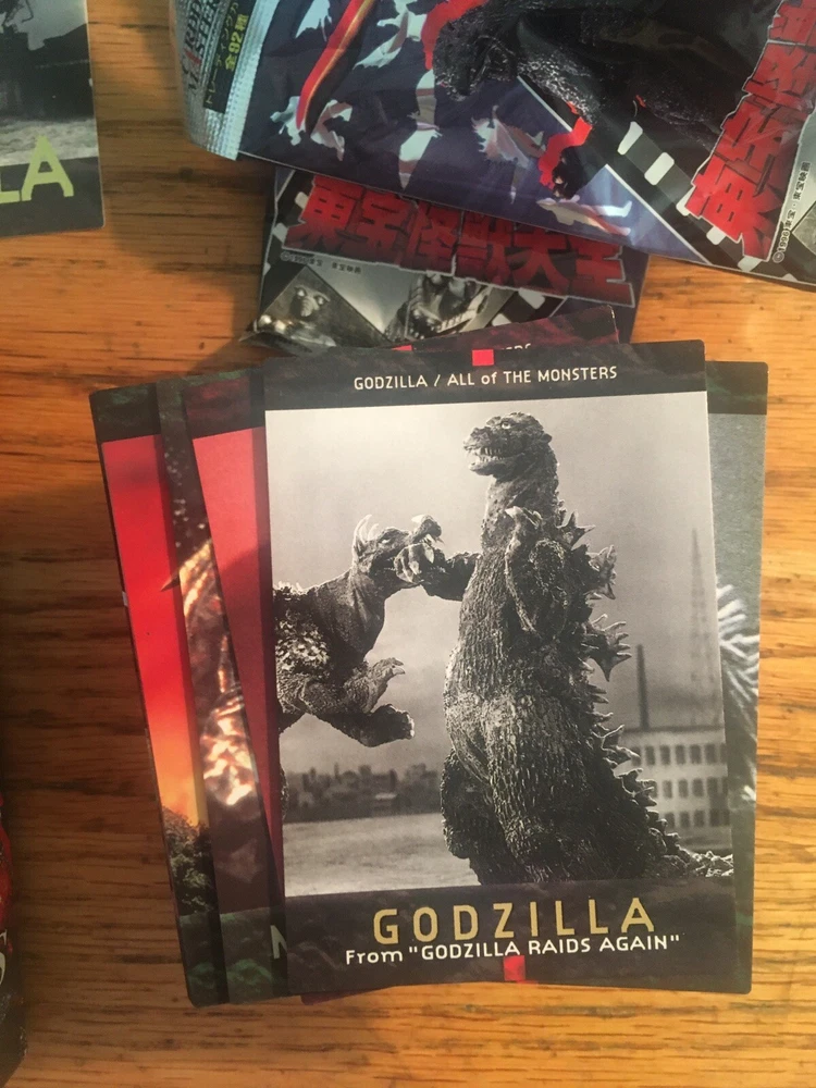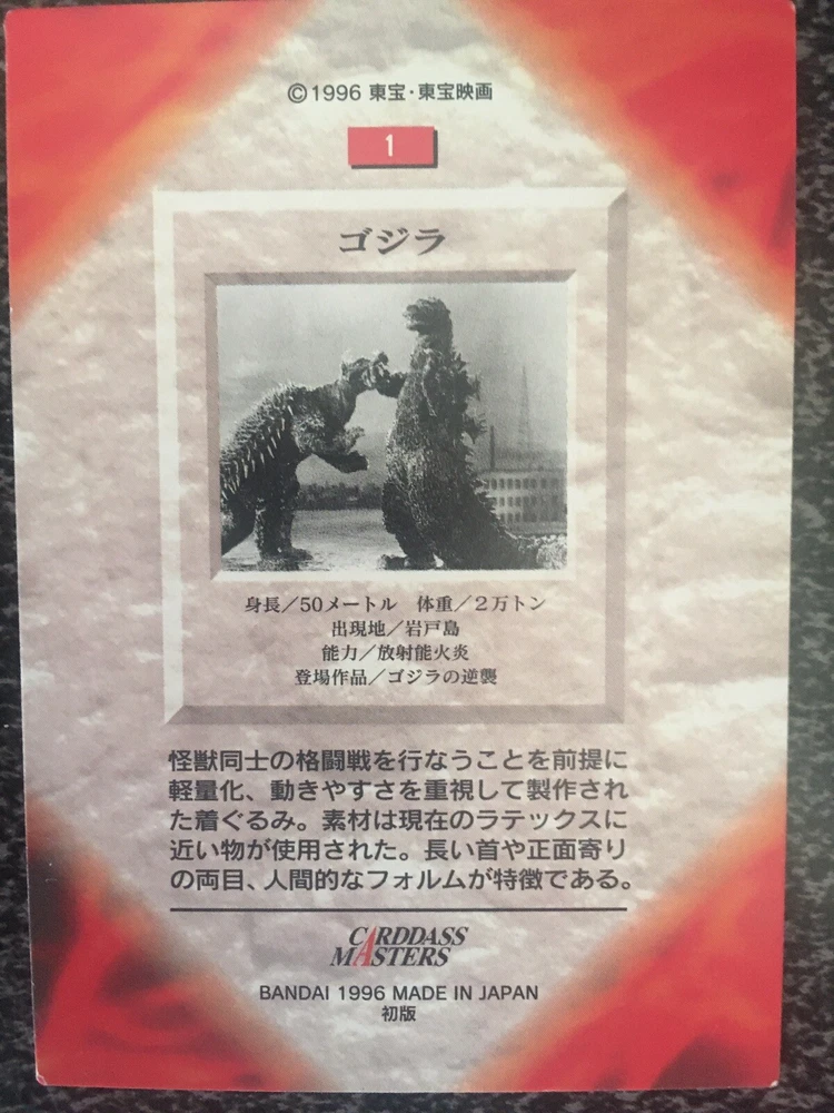 THIS SALE IS FOR THE 1996 BANDAI CARDDASS MASTERS GODZILLA SERIES BASE CARDS. ON THE FRONT IS THE ACTION PICTURES AND ON THE BACK IS THE INFO IN JAPANESE. THE BASE SET IS BROKEN INTO 3 CHAPTERS. EACH CARD IS $4.00. CHOOSE AS MANY AS YOU NEED. THERE ARE DUPLICATES (2) OF MANY OF THE CARDS. THE SET CONSIST OF 90 BASE CARDS WITH 2 SPECIALTY CARDS. SPECIALTY CARDS SOLD IN SEPARATE AUCTION. ALL CARDS WERE PULLED FROM THE PACKS. SEE PICTURES. THIS IS A VERY RARE ITEM SALE. PLEASE SEND ME YOU LIST UPON PAYMENT. THE LIST; A: ALL OF THE MONSTERS #1-GODZILLA (3) 2-ANGUIRUS (2) 3-RODAN (4) 4-MEGANURON (3) 5-MOGUERA (4) 6-VARAN (3) 8-MOTHRA (3) 11-MANDA (2) 12-GODZILLA (3) 13-DOGORA (4) 14-KING GHIDORAH (3) 16-BARAGON 17-GIANT OCTOPUS (3) 19-SANDA (2) 20-GAIRA (3) 21-EBIRAH (4) 23-GODZILLA (2) 26-KUMONGA (2) 27-GODZILLA (2) 28-GABARA (3) 29-GEZORA 31-KAMOEBAS (3) 32-HEDORAH (2) 33-GIGAN (2) 34-GODZILLA (2) 35-JET JAGUAR 37-MECHAGODZILLA2 (2) 38-KING CAESAR (4) 39-TITANOSAURUS (2) 40-GODZILLA (2) 41-GODZILLA 43-BIOLLANTE (2) 44-BIOLLANTE (2) 45-GODZILLA (3) 46-GODZILLASAURUS (4) 47-KING GHIDORAH (30 48-MECHA-KING GHIDORAH 49-DRAT (3) 50-GODZILLA (2) 51-MOTHRA (3) 52-MOTHRA (2) 53-BATTLA (3) 54-BATTLA (5) 56-BABY GODZILLA (4) 57-FIRE RODAN (3) 58-MECHAGODZILLA 60-GODZILLA (5) 61-LITTLE GODZILLA (4) 62-SPACEGODZILLA (5) 63-M.O.G.E.R.A. (3) 64-GODZILLA (2) 65-GODZILLA JR (2) 66-DESTOROYAH (4) 67-DESTOROYAH (5) 68-MOTHRA (4) 69-MOTHRA (4) 70-FAIRY 71-GARUGARU (2) 72-DESGHIDORAH (4) B: THE ALIENS 73-MYSTERIAN (4) 74-ALIEN X C: SUPER MECHANICS 75-ROCKETSHIP (4) 76-MARKALITE FAHRP 77-SPIP (5) 78-JX-X OHTORI (5) 79-ATORAGON 80-ATOMIC HEAT RAY CANNON (3) 81-A-CYCLE RAY VEHICLE (2) 82-DEADLY MESSER GUN (3) 83-MOONLIGHT SY-3 (2) 84-GOUTEN (4) 85-SUPER X (2) 86-HIGH-POWERED LASER BEAM VEHICLE (5) 87-SUPER X2 (4) 89-GARUDA (6) 90-SUPER X3 (6) I ALSO HAVE LISTED THE COMPLETE SET AND SPECIALTY CARDS OF THIS SERIES. PLEASE CHECK OUT MY OTHER GODZILLA AUCTIONS. ITEM WILL BE SHIPPED 1ST CLASS. IF YOU ANY QUESTIONS PLEASE ASK.