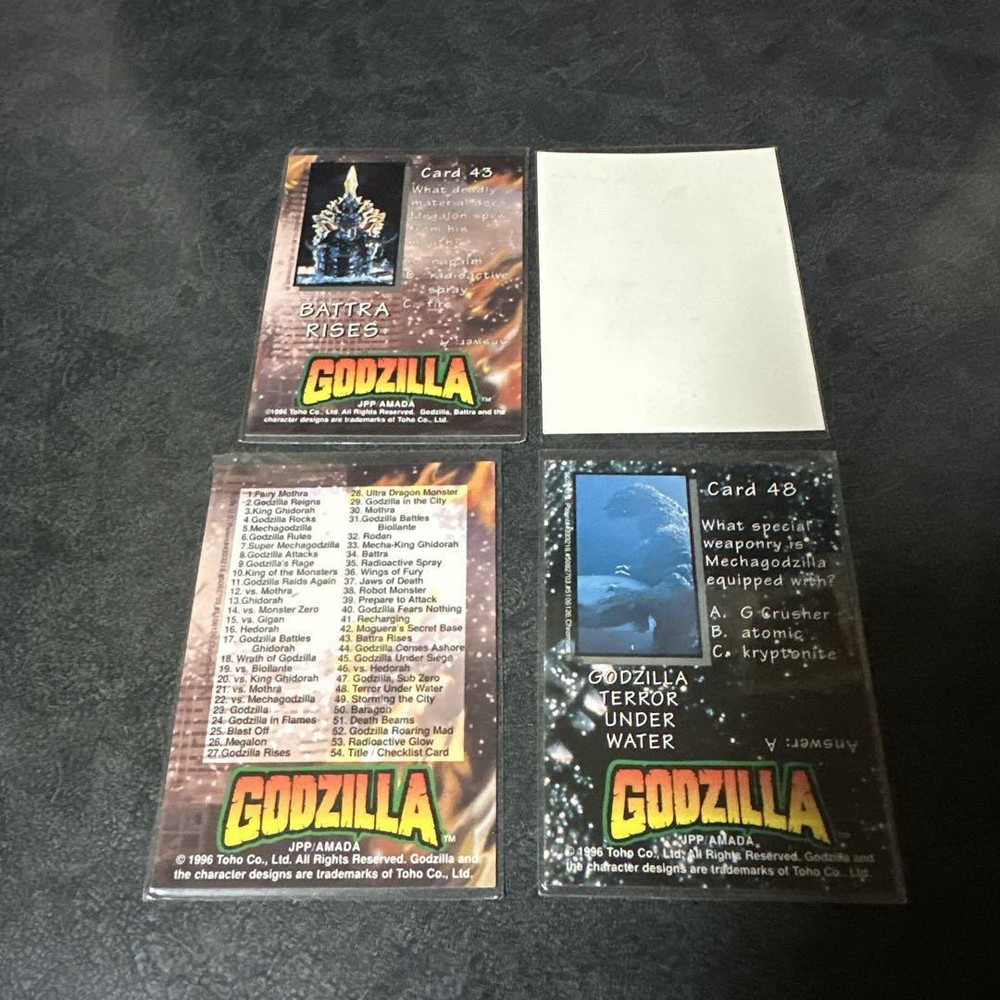 Item Title 1996 Godzilla Trading Card Set Of 4 Payment Supports managed payments Please pay within 5 days after auction is finished. About Us We are located in Japan. It's our pleasure to make you happy by proposing our recommend item. If you have any questions or request about items, please feel free to ask us. International Buyers - Please Note: -Import duties, taxes, and charges are not included in the item price or shipping charges. These charges are the buyer's responsibility. -Please check with your country's customs office to determine what these additional costs will be prior to bidding/buying. -These charges are normally collected by the delivering freight (shipping) company or when you pick the item up - do not confuse them for additional shipping charges. -We do not mark merchandise values below value or mark items as - gifts - The US and International government regulations prohibit such behavior. Thank you for your understanding.