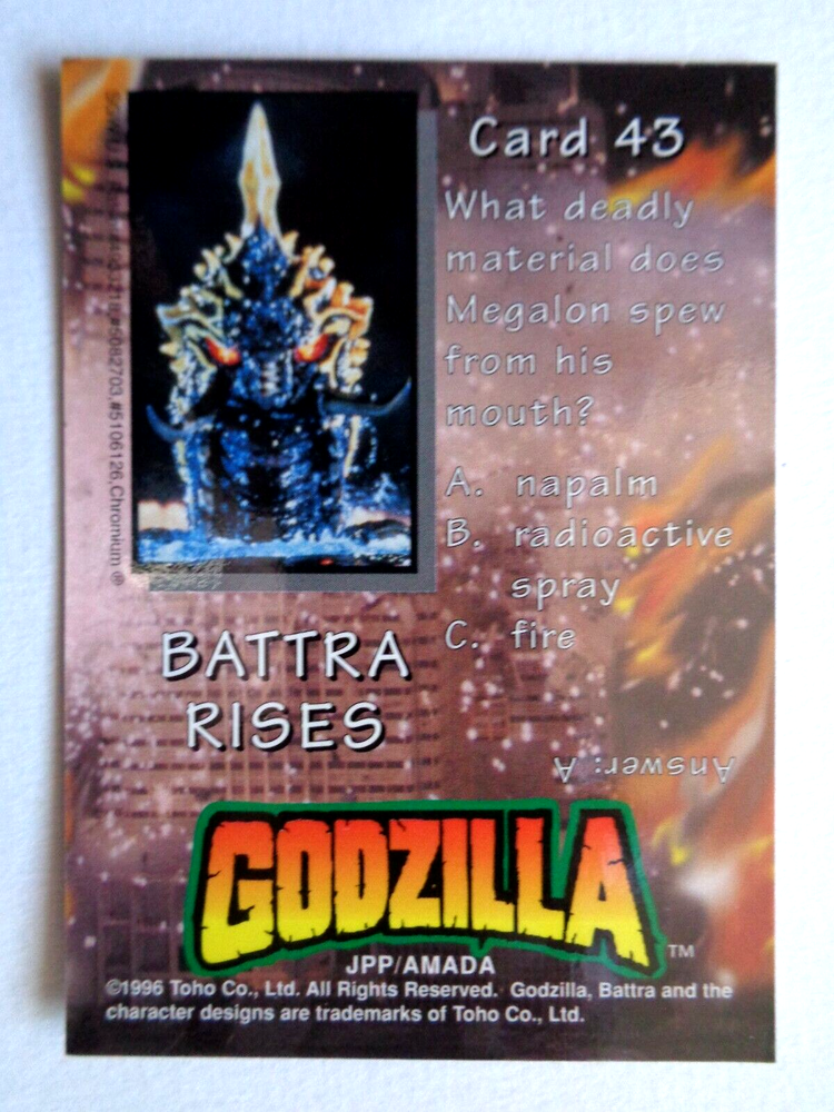Here is hard to find card #43 titled "Batra Rises" from the *Godzilla Chromium* card set produced by JPP Amada in 1996. The card is in NM condition straight from a pack. Check out my other items and combine wins to save postage. If purchasing multiple items please use the "Add to cart" function then click "Request total from seller" to obtain an invoice with combined postage. Payment within 3 days please.