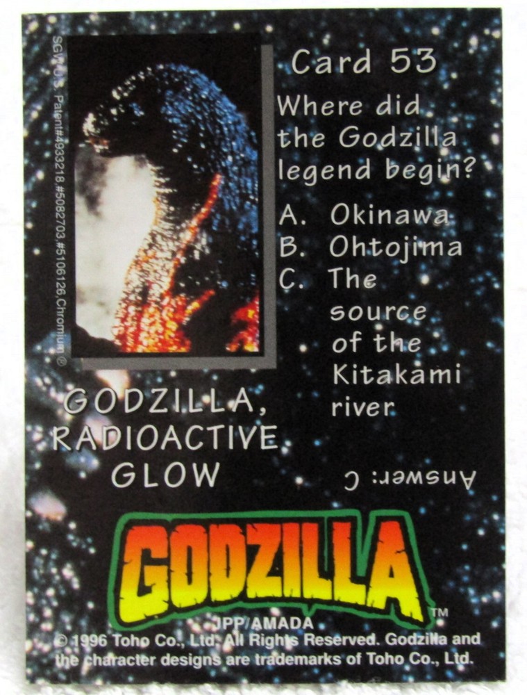 1996 JPP / Amada Toho Burning Godzilla Radioactive Glow Chromium Trading Card #53 I list all my cards as 'Heavily played (Poor)' even if they might be in mint condition. Please check the pics carefully for defects. If I notice anything out of the ordinary I will add extra pics. All Cards are placed in a new penny sleeve, followed by a top loader and then sealed in a team bag before shipping. ________________________ PAYMENT ________________________ * Payment must be received within 7 days or I will re-list the item/s and cancel the transaction to recover my lost fees. * If you're buying more than one item then please pay for everything in one combined invoice. ________________________ SHIPPING ________________________ * I ship Worldwide! * Shipping within the USA is FREE! International shipping is available for only $3.00 ..however, there is no tracking number so please use this option at your own risk. ________________________ OTHER ________________________ * Picture is of the actual Item being sold. Unless there are multiple quantities available, in which case you can expect them all to be in similar condition compared to the pic shown.
