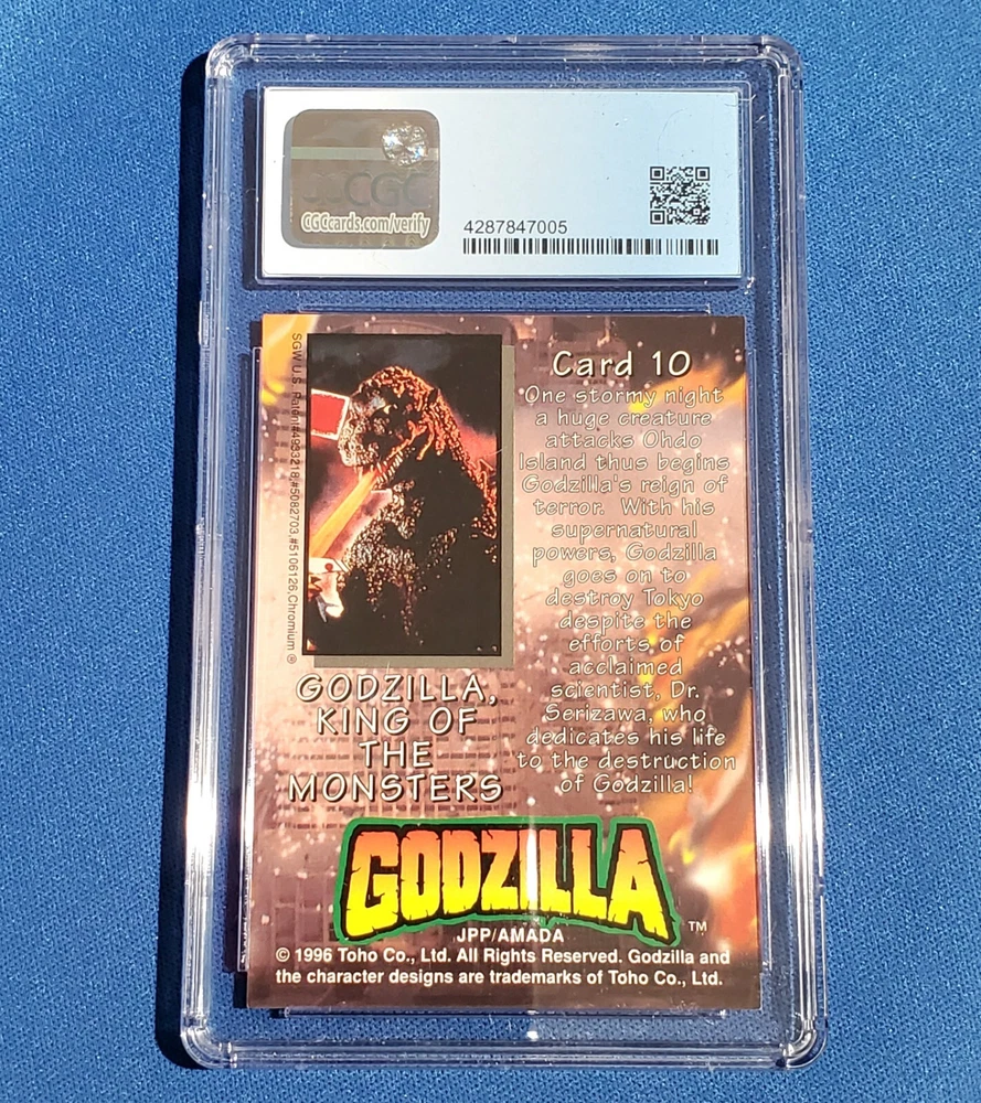 JPP/AMADA Godzilla Chromium #10 Godzilla: King of the Monsters CGC GRADED 8.5 - NM/MINT+ Card in pictures is the exact card you will receive. slab stored double sleeved and will ship very well protected, and IN A BOX to ensure no damage in transit.