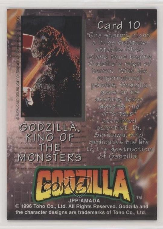 1996 JPP/Amada Godzilla Chromium - [Base] #10 Godzilla, King of the Monsters COMC Item: 86880641 - Non-Sports Card Search for more: 1996 JPP/Amada Godzilla Chromium Search for more: 1996 JPP/Amada Godzilla Chromium - [Base] View all of our Listings Auctions Buy It Now About Us Located in the beautiful Pacific Northwest, COMC (Check Out My Cards) is the world's largest consignment service for trading card singles. More than 10,000 people have used our consignment service to list over 50 million trading cards. Find out how we can help you consign your items on eBay by contacting us through eBay messaging. COMC -- "The Safe & Easy Way to Buy & Sell" Raw Condition for Modern Cards Unless otherwise noted, raw modern cards are listed in Near Mint-Mint condition or better. A NM-MT card appears to be Mint at first glance, but upon closer inspection, may exhibit some of the following: minor print defects (e.g. roller marks, print line, dimple), minor scratches, slight edge wear, and slight corner wear. Centering is clearly visible in the images provided and does not factor into our condition assessment. Raw Condition for Vintage Cards Unless otherwise noted, raw vintage cards are listed in Excellent condition or better. An EX card may exhibit some of the following: minor rounding of corners, surface wear, print defects, light scratches, and slight edge wear/chipping. Centering is clearly visible in the images provided and does not factor into our condition assessment. Domestic Shipping Combined shipping for multiple items is available. To receive combined shipping, please ensure all desired items are in your eBay shopping cart before proceeding to checkout. eBay limits orders to 40 items per order. We automatically combine multiple orders placed on the same day. If you place multiple orders on the same day, please contact us to request a refund of applicable shipping costs. Signature confirmation may be required on invoices over $400. All cards are protected and shipped securely. International Shipping COMC offers eBay's International Shipping (EIS) for international orders under $2,500* (see country exceptions below). All duties and import fees are paid at checkout; in the rare event that there are additional import fees upon delivery, these are borne by the buyer. EIS packages route through a shipping hub in Erlanger, KY before shipping to their final destination. Please note that EIS does not allow for combined shipments. The shipping rates are determined by eBay and cannot be adjusted. *Maximum sale price exceptions: Colombia, Kuwait ($2,000); Taiwan ($1,539); Chile, Costa Rica, Guatemala, Honduras, Trinidad and Tobago ($1,000); Antigua and Barbuda, Aruba, Belize, Dominica, Grenada, Philippines, Saint Kitts and Nevis, Saint Lucia, Montserrat, Turks and Caicos Islands ($500); Dominican Republic, El Salvador ($200). Please request a shipping quote through eBay messaging for orders that exceed the maximum sale price supported by eBay's International Shipping. You will be responsible for all duties and import fees for international orders shipped outside the EIS. All cards are protected and shipped securely. Payment COMC does not accept offers on our cards through our eBay storefront. COMC utilizes eBay’s managed payments system. If you are experiencing difficulties making a payment, please contact eBay for assistance. Return Policy Returns are only accepted on the rare occasion the item is not as described. If you are making a return, please initiate the return process through eBay so a mailing label can be provided for you. Prior to listing, our expert team carefully assessed this item to represent it accurately. Please review the description and high-definition images prior to purchasing to ensure this item meets your satisfaction. We welcome you to contact us if you have further questions about this item. Trust and Integrity COMC carefully assesses each item consigned to us to prevent fraudulent items from entering the marketplace. If you believe an item offered on COMC may be fraudulent, please contact us with details so we can investigate the issue. Items we determine are outside our supported items policy may be removed. Last Modified: 6/14/2025 4:51:28 PM PDT