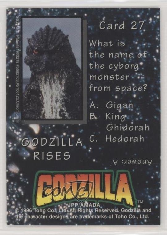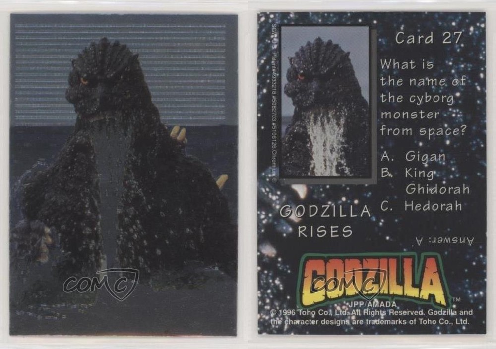 This Godzilla card is a must-have for collectors! The vibrant chromium finish makes the artwork pop, and the classic 1996 design brings serious nostalgia. Perfect condition, great detail—adds awesome value to any collection. Highly recommend grabbing this before it's gone!