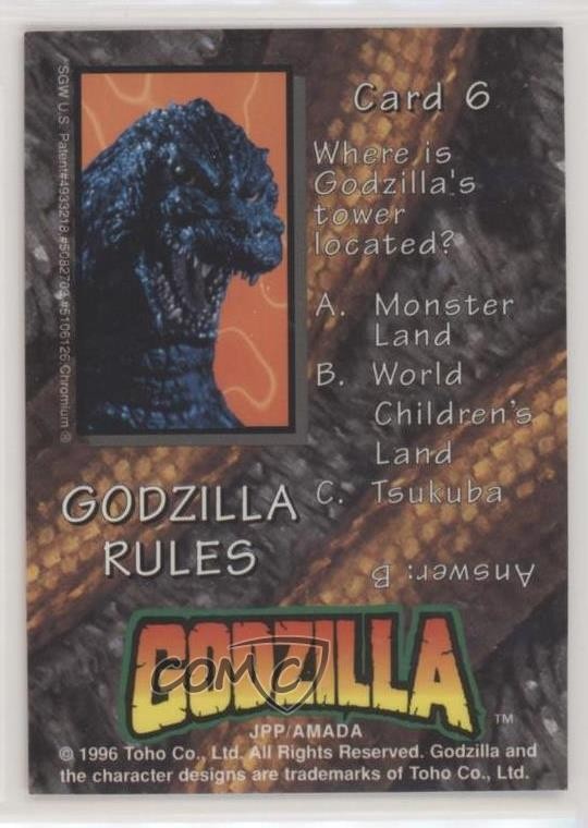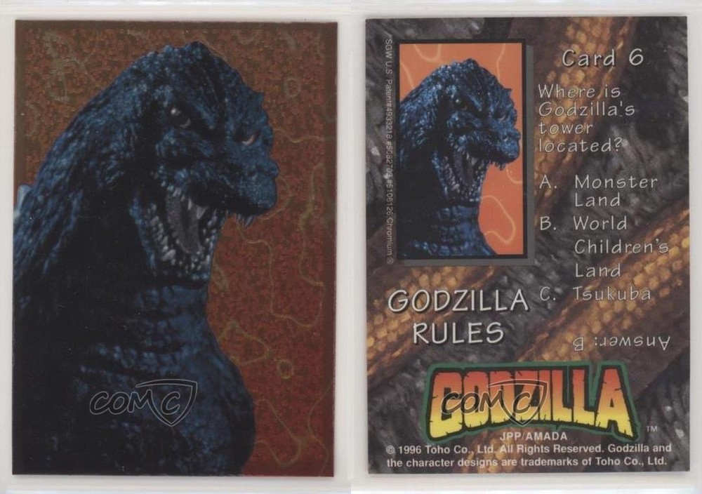 1996 JPP/Amada Godzilla Chromium - [Base] #6 Godzilla Rules COMC Item: 86880647 - Non-Sports Card - Featuring Godzilla Search for more: 1996 JPP/Amada Godzilla Chromium Search for more: 1996 JPP/Amada Godzilla Chromium - [Base] View all of our Listings Auctions Buy It Now About Us Located in the beautiful Pacific Northwest, COMC (Check Out My Cards) is the world's largest consignment service for trading card singles. More than 10,000 people have used our consignment service to list over 50 million trading cards. Find out how we can help you consign your items on eBay by contacting us through eBay messaging. COMC -- "The Safe & Easy Way to Buy & Sell" Raw Condition for Modern Cards Unless otherwise noted, raw modern cards are listed in Near Mint-Mint condition or better. A NM-MT card appears to be Mint at first glance, but upon closer inspection, may exhibit some of the following: minor print defects (e.g. roller marks, print line, dimple), minor scratches, slight edge wear, and slight corner wear. Centering is clearly visible in the images provided and does not factor into our condition assessment. Raw Condition for Vintage Cards Unless otherwise noted, raw vintage cards are listed in Excellent condition or better. An EX card may exhibit some of the following: minor rounding of corners, surface wear, print defects, light scratches, and slight edge wear/chipping. Centering is clearly visible in the images provided and does not factor into our condition assessment. Domestic Shipping Combined shipping for multiple items is available. To receive combined shipping, please ensure all desired items are in your eBay shopping cart before proceeding to checkout. eBay limits orders to 40 items per order. We automatically combine multiple orders placed on the same day. If you place multiple orders on the same day, please contact us to request a refund of applicable shipping costs. Signature confirmation may be required on invoices over $400. All cards are protected and shipped securely. International Shipping COMC offers eBay's International Shipping (EIS) for international orders under $2,500* (see country exceptions below). All duties and import fees are paid at checkout; in the rare event that there are additional import fees upon delivery, these are borne by the buyer. EIS packages route through a shipping hub in Erlanger, KY before shipping to their final destination. Please note that EIS does not allow for combined shipments. The shipping rates are determined by eBay and cannot be adjusted. *Maximum sale price exceptions: Colombia, Kuwait ($2,000); Taiwan ($1,539); Chile, Costa Rica, Guatemala, Honduras, Trinidad and Tobago ($1,000); Antigua and Barbuda, Aruba, Belize, Dominica, Grenada, Philippines, Saint Kitts and Nevis, Saint Lucia, Montserrat, Turks and Caicos Islands ($500); Dominican Republic, El Salvador ($200). Please request a shipping quote through eBay messaging for orders that exceed the maximum sale price supported by eBay's International Shipping. You will be responsible for all duties and import fees for international orders shipped outside the EIS. All cards are protected and shipped securely. Payment COMC does not accept offers on our cards through our eBay storefront. COMC utilizes eBay’s managed payments system. If you are experiencing difficulties making a payment, please contact eBay for assistance. Return Policy Returns are only accepted on the rare occasion the item is not as described. If you are making a return, please initiate the return process through eBay so a mailing label can be provided for you. Prior to listing, our expert team carefully assessed this item to represent it accurately. Please review the description and high-definition images prior to purchasing to ensure this item meets your satisfaction. We welcome you to contact us if you have further questions about this item. Trust and Integrity COMC carefully assesses each item consigned to us to prevent fraudulent items from entering the marketplace. If you believe an item offered on COMC may be fraudulent, please contact us with details so we can investigate the issue. Items we determine are outside our supported items policy may be removed. Last Modified: 7/15/2025 4:54:06 AM PDT