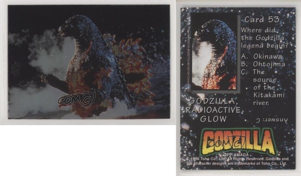 This 1996 JPP/Amada Godzilla Chromium card is a must-have for any collector! The radioactive glow effect makes Godzilla pop with vibrant colors, and the chromium finish adds a premium feel. The condition is excellent, and it’s a standout piece in my collection. COMC’s reliable service made the purchase smooth and easy. Highly recommended for fans of vintage Godzilla memorabilia!
