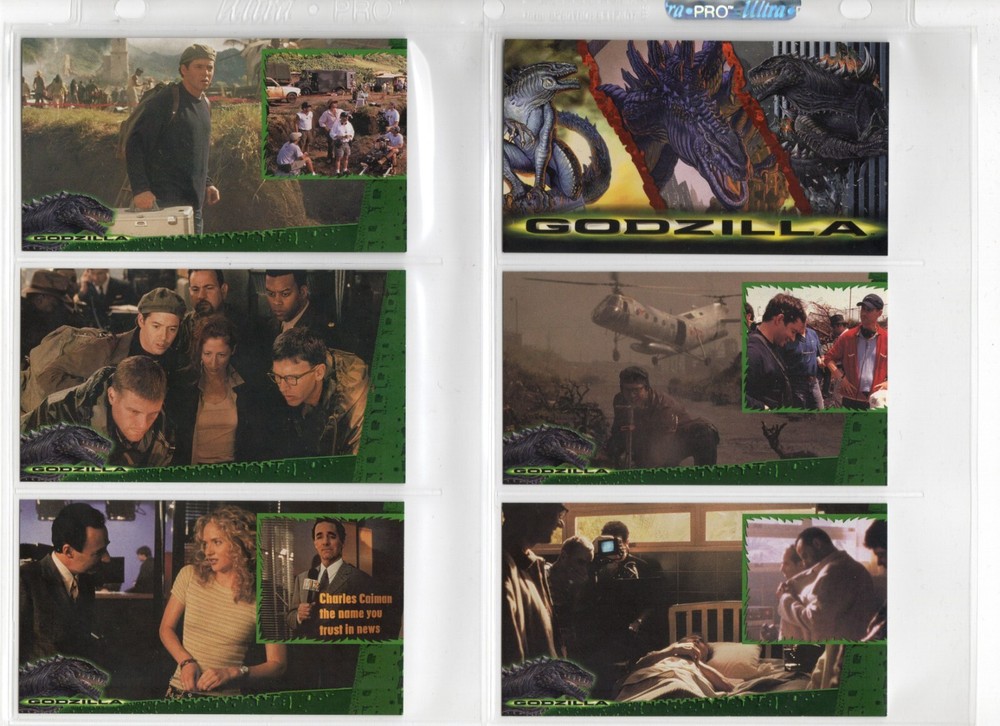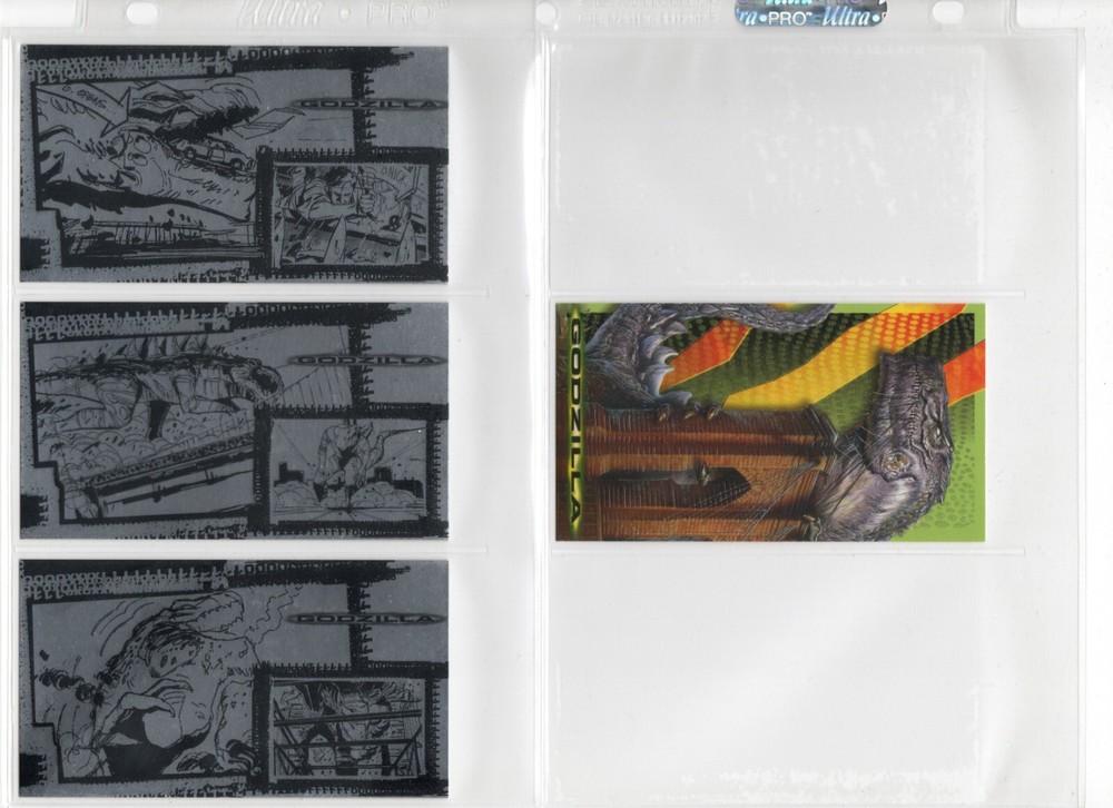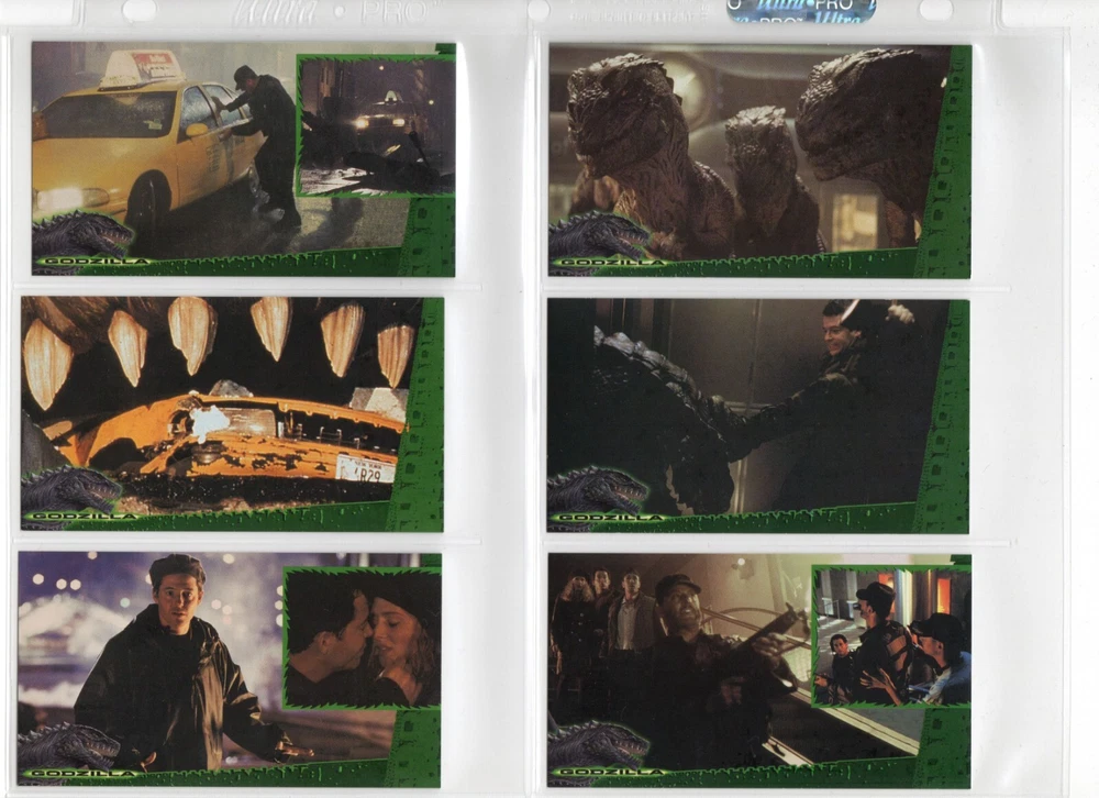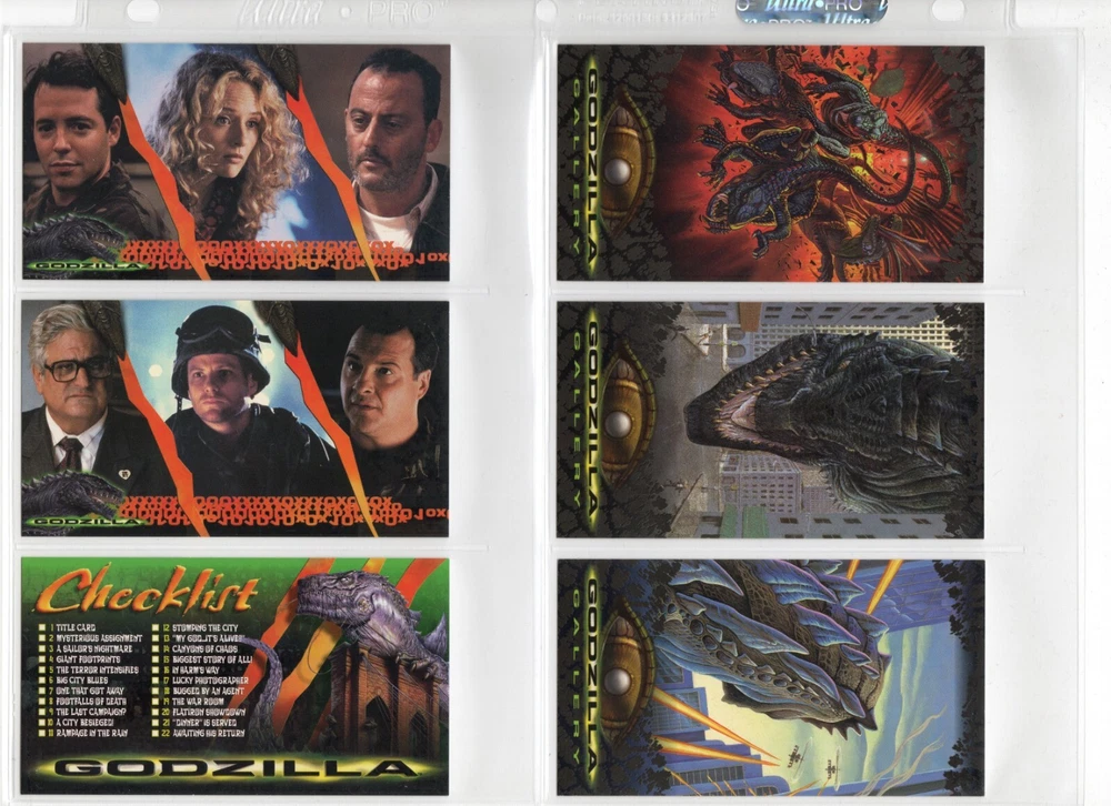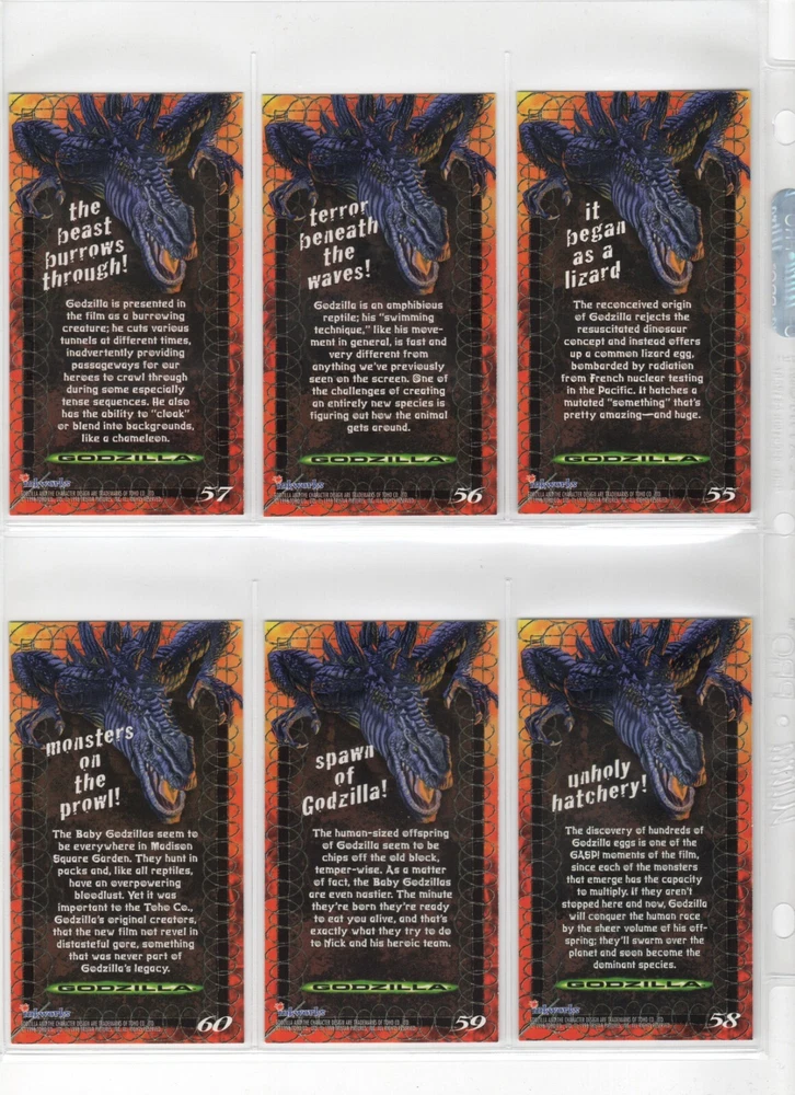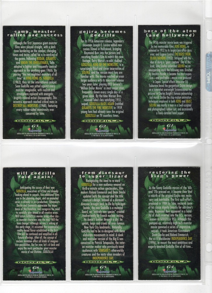 The 1998 Godzilla Supervue 72-Card Set is a highly sought-after collectible featuring iconic images from the Godzilla franchise. Manufactured by INKWORKS, this set includes Glowzilla Glow-in-the-Dark, Silverzilla Foil, and Supreme Skin cards, adding to the excitement and value for collectors. With a total of 72 cards and unique features, this set captures the essence of the legendary monster and is a must-have for fans of Godzilla and non-sport trading cards. Here is what is included - 72-Card Set 6-Card Glowzilla Glow-in-the-Dark Set 3-Card Silverzilla Foil Set GS1 Supreme Skin Card Mother Of All Monsters The cards are placed in 9-card pages, and then placed into a folio binder. Cards will be shipped in a large padded envelope.