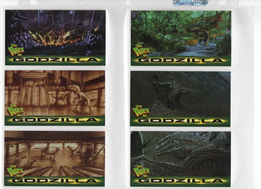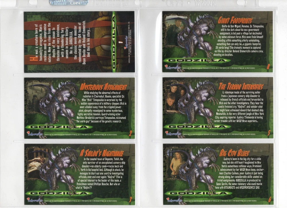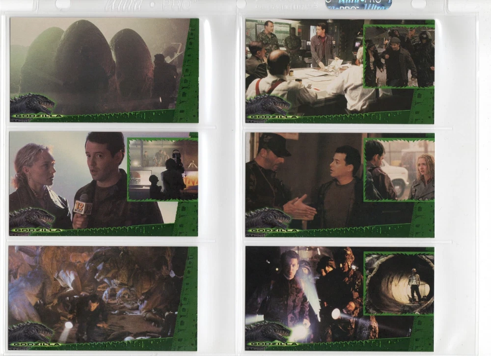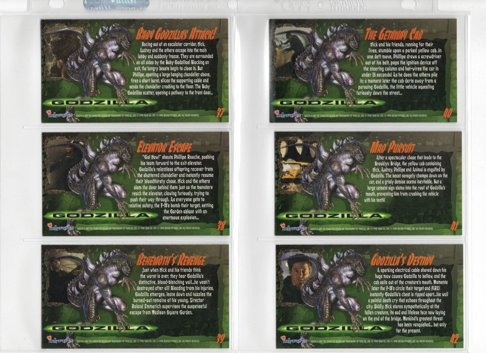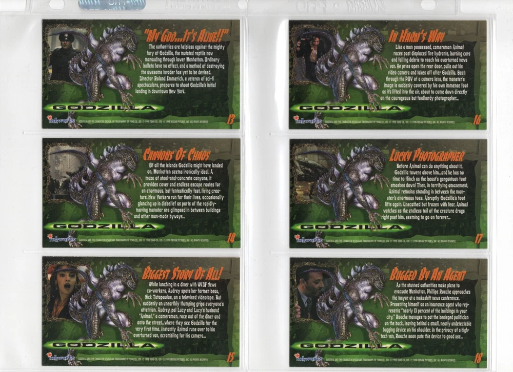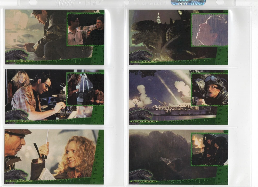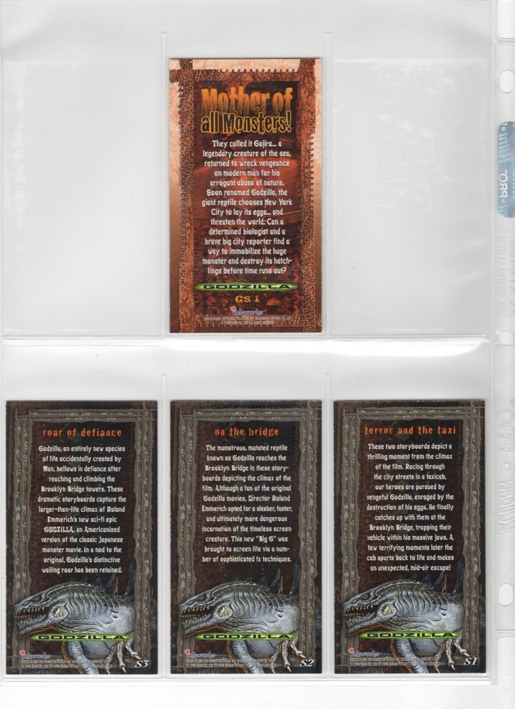 The 1998 Godzilla Supervue 72-Card Set is a highly sought-after collectible featuring iconic images from the Godzilla franchise. Manufactured by INKWORKS, this set includes Glowzilla Glow-in-the-Dark, Silverzilla Foil, and Supreme Skin cards, adding to the excitement and value for collectors. With a total of 72 cards and unique features, this set captures the essence of the legendary monster and is a must-have for fans of Godzilla and non-sport trading cards. Here is what is included - 72-Card Set 6-Card Glowzilla Glow-in-the-Dark Set 3-Card Silverzilla Foil Set GS1 Supreme Skin Card Mother Of All Monsters The cards are placed in 9-card pages, and then placed into a folio binder. Cards will be shipped in a large padded envelope.