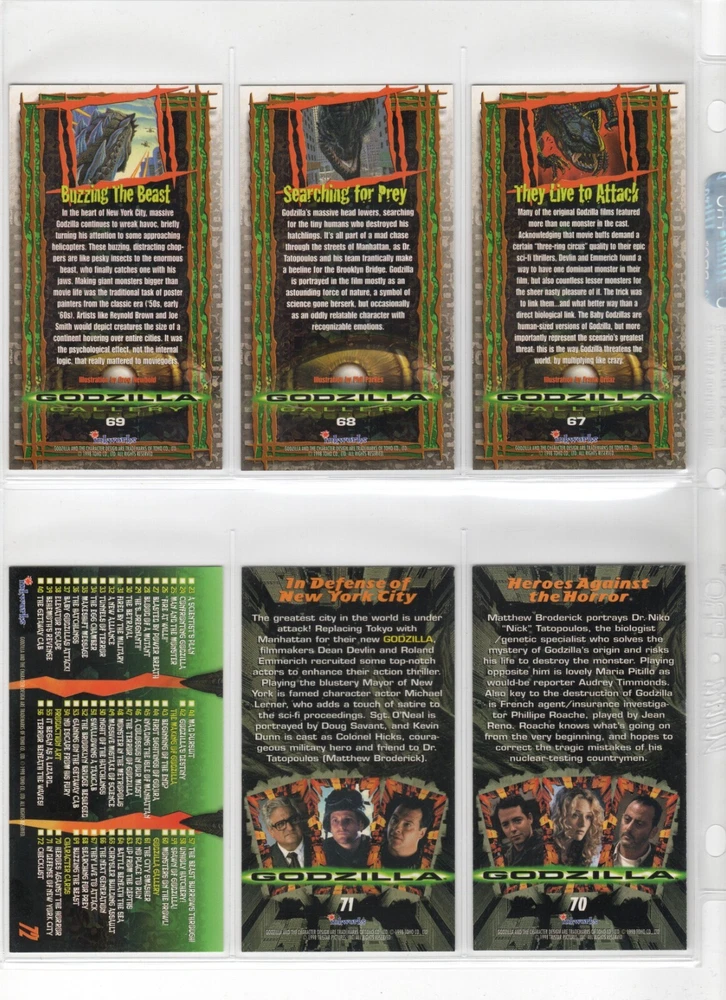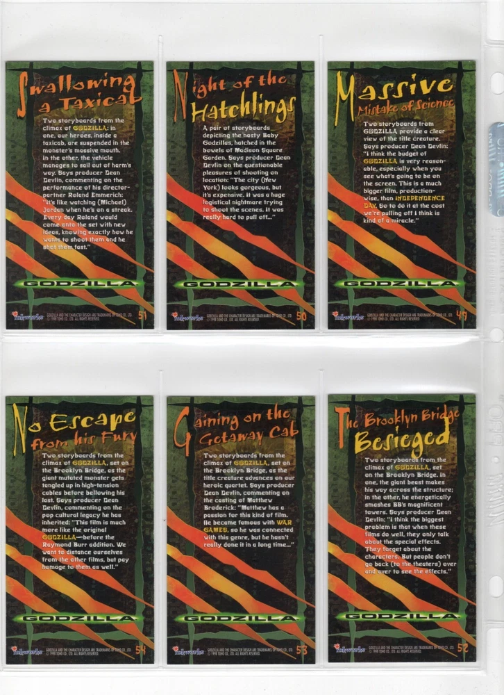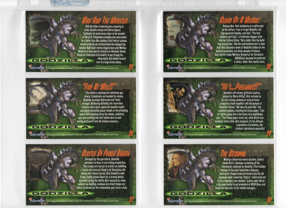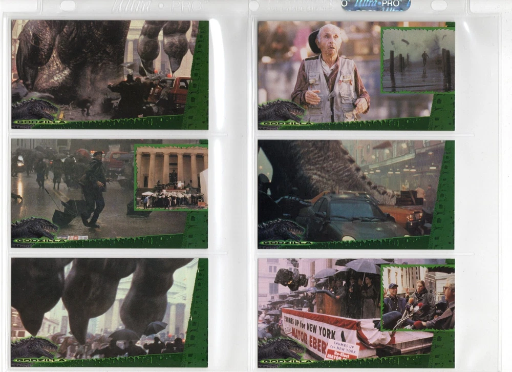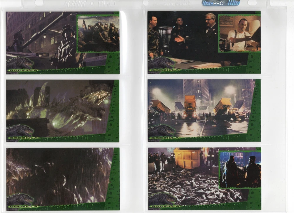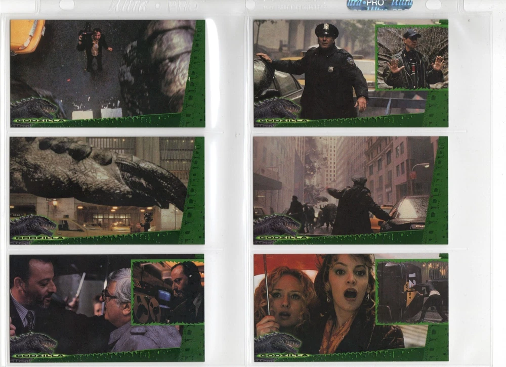 The 1998 Godzilla Supervue 72-Card Set is a highly sought-after collectible featuring iconic images from the Godzilla franchise. Manufactured by INKWORKS, this set includes Glowzilla Glow-in-the-Dark, Silverzilla Foil, and Supreme Skin cards, adding to the excitement and value for collectors. With a total of 72 cards and unique features, this set captures the essence of the legendary monster and is a must-have for fans of Godzilla and non-sport trading cards. Here is what is included - 72-Card Set 6-Card Glowzilla Glow-in-the-Dark Set 3-Card Silverzilla Foil Set GS1 Supreme Skin Card Mother Of All Monsters The cards are placed in 9-card pages, and then placed into a folio binder. Cards will be shipped in a large padded envelope.