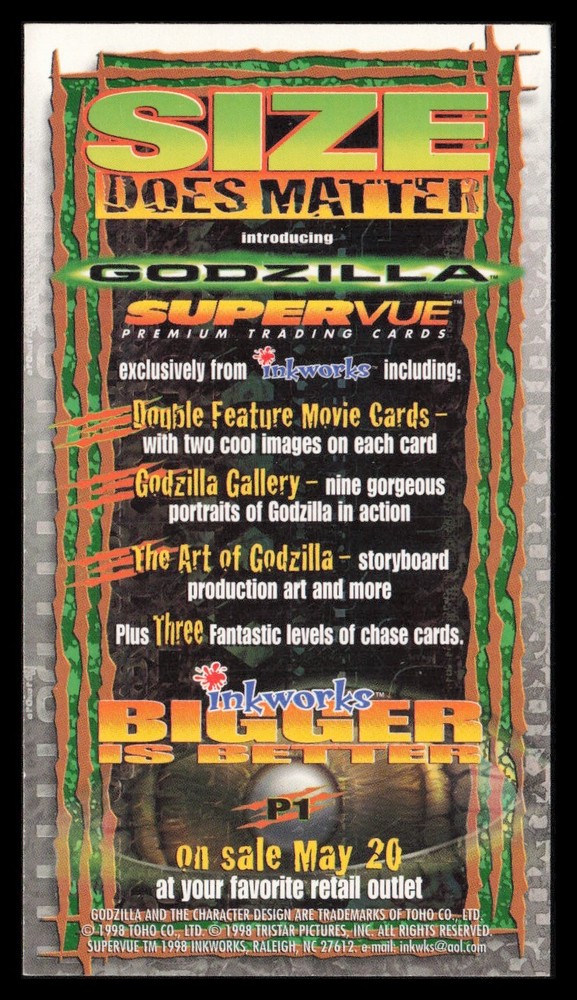 Sports/Non-Sports card(s). Player: Godzilla Brand: Inkworks Year: 1998 Includes: Promo Cards are mostly VG or better. See high resolution scans for condition details. Picture(s) are of the actual item(s) (as described above) you will receive. Please let me know if you have questions regarding condition and/or included items before purchasing. FINE PRINT Sales are final but I will work with buyer if item condition is not as described. Please let me know if there is an issue. Stored in a non smoking home. Check my other listings for more wacky stuff. SHIPPING/PAYMENT INFO Buyer to pay shipping of $1.00 for the first card(s)/listing and $0.25 for each additional card (US funds) for USPS Mail (in USA only). International (outside of the United States) shipping is through the Ebay Global shipping program and postage is determined by Ebay. Buyer is responsible for all import/custom duties, fees, taxes, charges, levies and associated paperwork/regulatory issues. Usually shipped within 2 BUSINESS days after receipt of payment. Powered by SixBit's eCommerce Solution