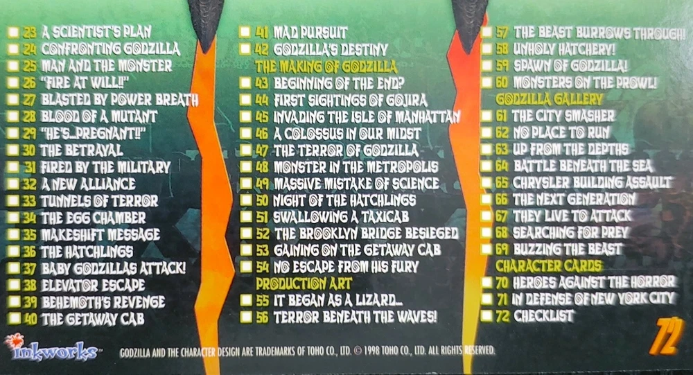 1998 Inkworks Godzilla Movie Supervue Trading Card Singles #1-72 You Pick Buy 2 Get 2 Free! Near Mint! When mixing & matching movie titles within the sale it'll charge you that additional $1.00 for the 1st card for each new movie title chosen, but I'll always refund you back that difference for each alternate title so it is just $1.00 for the 1st card and $0.15 for each additional. Unfortunately there's no way around this at this time according to eBay until they give me more promotional rule shipping options to choose from where it doesn't do this. This only applies to mixing & matching movie titles within the same purchase, if purchasing from just one movie title it auto calculates just fine. Will ship inside a penny sleeve, inside a top loader, inside a team bag. If cards total more than 15 in a single transaction they'll be an additional tracking number provided via eBay envelope. ( so X2 tracking numbers total ) More than 31 in a single transaction will ship Ground Advantage. Breakdown below: 15 cards or less - one tracking number via eBay envelope 16-30 cards - two tracking numbers via eBay envelope 31+ cards - Ground Advantage Any questions, just message me, thanks for looking! :)
