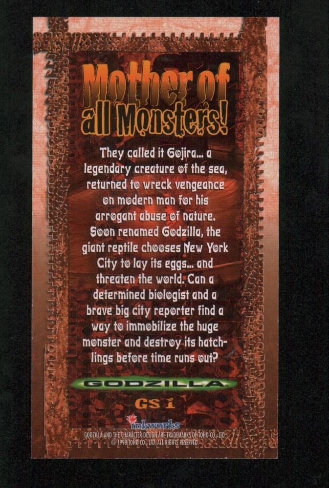Item description: 1998 Inkworks Godzilla The Movie Supervue - #GS1 Mother of Monsters. See photos for details. IMAGINAIRE STORE: Formerly Simon Bourque Sports Cards. Since 1988, Imaginaire specializes in trading cards, stamps, collectibles, and memorabilia . SHIPPING COSTS: Combine items and save on shipping costs. Price varies depending on the size and weight of the parcel. Shipping costs are usually between $8 to $10 for Canada, $16 for the USA, and $20 for international shipping. Please note that all packages over $100 will be automatically sent via registered postal service with tracking number. In such cases, price will vary depending on the size and weight of the parcel, but shipping costs are usually between $12 to $15 for Canada, $18 to $25 for the USA, and $35 to $40 for international shipping. NOTICE INFORMATION: PLEASE NOTE that p ayment must be received within 7 business days of the end of auction unless prior arrangements have been made. Item(s) will be shipped within 48 hours of the payment's reception. If you have any questions, please email us.