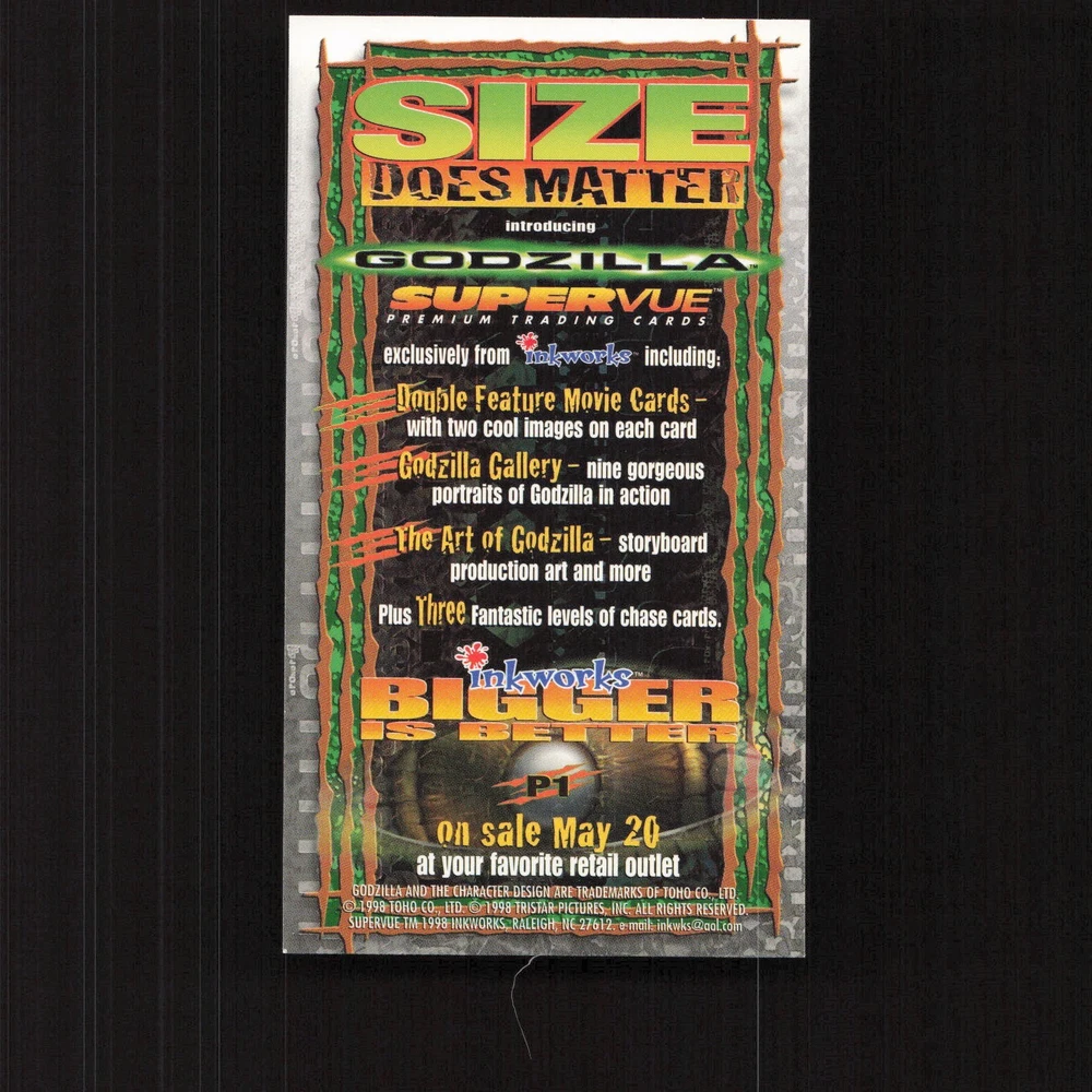 Item description : 1998 Inkworks Godzilla The Movie Supervue Promos #P1. See photos for details. IMAGINAIRE STORE: Formerly Simon Bourque Sports Cards. SInce 1988 Imaginaire specialises in trading cards, stamps, collectibles and memorabilia . SHIPPING COSTS: Combine items and save on shipping costs. Price varies depending on the size and weight of the parcel. Canada is usually between $8 to $10, USA is usually $16 and International is $20. Please note that all packages over $100.00 value will be automatically sent via registered postal service with tracking number. Price varies depending on the size and weight of the parcel. Canada is usually between $12 to $15, USA is usually between $18 to $25 and International is usually $35 to $40. NOTICE INFORMATION: '' PLEASE NOTE'' Payment must be received within 7 business days of the end of auction unless prior arrangements have been made. Item(s) will be shipped in the next 48 hours after payment is received. If you have any questions, please email us.