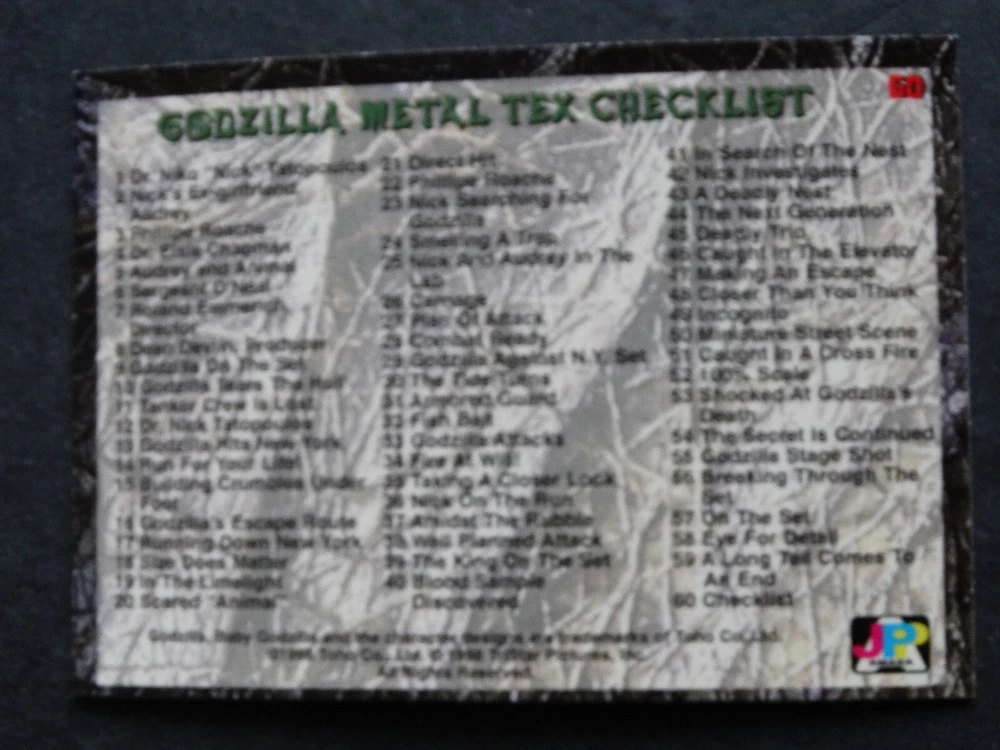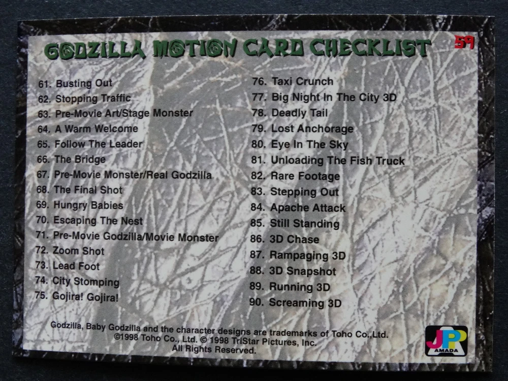 1998 JPP/Amanda Godzilla Movie Trading Card Complete Your Set You U Pick 1-90 *****The cards that don't show the front of the card have defects as shown in the pictures***** 1 Dr. Niko "Nick" Tatopoulos 2 Nick's Ex-girlfriend, Audrey 3 Phillipe Roche 4 Dr. Elsie Chapman 5 Audrey and Animal 6 Sergeant O'Neal 7 Roland Emmerich, Director 8 Dean Devlin, Producer 9 Godzilla On The Set 10 Godzilla Tears The Hull 11 Tanker Crew Is Lost 12 Dr. Nick Tatopoulos 13 Godzilla Hits New York 14 Run For Your Life! 15 Building Crumbles Under Foot 16 Godzilla's Escape Route 17 Running Down New York 18 Size Does Matter 19 In The Limelight 20 Scared "Animal" 21 Direct Hit 22 Phillipe Roche 23 Nick Searching For Godzilla 24 Smelling A Trap 25 Nick And Audrey In The Lab 26 Carnage 27 Plan Of Attack 28 Combat Ready 29 Godzilla Against N.Y. Set 30 The Tide Turns 31 Armored Guard 32 Fish Bait 33 Godzilla Attacks 34 Fire At Will! 35 Taking A Closer Look 36 Nick On The Run 37 Amidst The Rubble 38 Well Planned Attack 39 The King On The Set 40 Blood Sample Discovered 41 In Search Of The Nest 42 Nick Investigates 43 A Deadly Nest 44 The Next Generation 45 Deadly Trio 46 Caught In The Elevator 47 Making An Escape 48 Closer Than You Think 49 Incognito 50 Miniature Street Scene 51 Caught In A Cross Fire 52 100% Scale 53 Shocked At Godzilla's Death 54 The Secret Is Continued 55 Godzilla Stage Shot 56 Breaking Through The Set 57 On The Set 58 Eye For Detail 59 Godzilla Metal Tex Checklist 60 Godzilla Motion Card Checklist 61 Busting Out 62 Stopping Traffic 63 Pre-Movie Art/Stage Monster 64 A Warm Welcome 65 Follow The Leader 66 The Bridge 67 Pre-Movie Monster/Real Godzilla 68 The Final Shot 69 Hungry Babies 70 Escaping The Nest 71 Pre-Movie Godzilla/Movie Monster 72 Zoom Shot 73 Lead Foot 74 City Stomping 75 Gojira! Gojira! 76 Taxi Crunch 77 Big Night In The City 3D 78 Deadly Tail 79 Lost Anchorage 80 Eye In The Sky 81 Unloading The Fish Truck 82 Rare Footage 83 Stepping Out 84 Apache Attack 85 Still Standing 86 3D Chase 87 Rampaging 3D 88 3D Snapshot 89 Running 3D 90 Screaming 3D IF YOU BUYING MULTIPLE SEND ONE PAYMENT. THANKS! Outside the U.S. Postage is Extra. International Shipping - items may be subject to customs processing depending on the item's declared value. Sellers set the item's declared value and must comply with customs declaration laws. As the buyer, you should be aware of possible: - delays from customs inspection. - import duties and taxes which buyers must pay. - brokerage fees payable at the point of delivery. Your country's customs office can offer more details, or visit eBay's page on international trade .