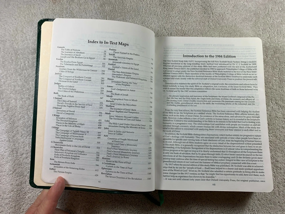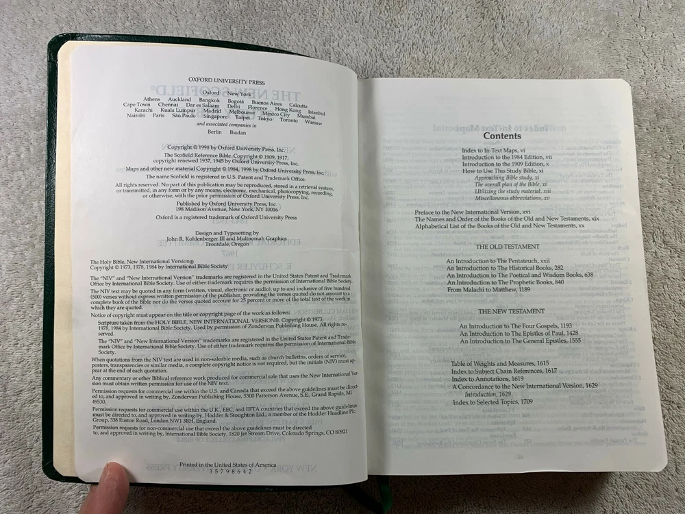 Please read the description carefully, examine the pics closely as they are part of the description, and ask any questions before buying! For your consideration is a Bible, this being the " The New Scofield Reference Bible - New International Version "; published by Oxford university press, copyright 1998 . Red letter, Concordance, all the bells and whistles expected of a Scofield Reference Bible. This green bonded leather Bible is in about good to very good condition or so. The pics tell the story. There's some wear and tear, shelf and edge wear, cover gilt looks nice, text block gilt shows some light wear. There's some sticker residue on the back cover. Some minimal writing (no writing in the presentation page/family area), no dog ears, loose pages, water damage, tears, etc. The binding is well attached. I would ask you to see the pics to get a good idea of it's condition, as I am not a book grader, and you be the judge! It measures about 7" x 9-3/8" x 1-5/8". This would be a nice authentic addition to your library, or a great gift for the Bible collector in your life! This will be wrapped carefully so it will arrive exactly how you see it here, post office willing. I ship quickly via USPS Ground Advantage or Priority Mail, both with Insurance and Tracking, unless otherwise requested. I expect excellence as both a buyer and seller on eBay, and will extend no less to you. Please check my feedback and buy with confidence! Please note before bidding: - International buyers - shipping is through the Global Shipping Program only. - Returns accepted only if I misrepresent the item, it gets damaged in shipping, or some other legitimate circumstance arises. Other frivolous returns will have the shipping both ways deducted from the return and may be subject to a 50% restocking fee. Not accepted: buyer's remorse, not reading the description, not looking at the pics, etc . Thanks! Please be sure to check out my other listings! :D