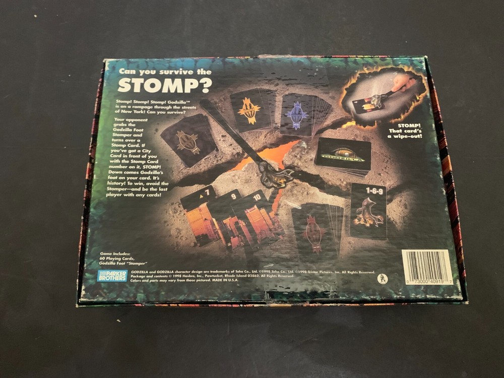 ITEM: 1998 Parker Brothers Godzilla Street Stomping Game DESCRIPTION: This is a 1998 Parker Brothers Godzilla Street Stomping Game. Nice Find ! This is complete. The size is approximately 10 inches by 2 inches by 7 1/2 inches. CONDITION: This in in Very Good condition with minor shelf ware to box . The pictures are part of the description, so please view all pictures. This is being sold as shown, so if you have any questions please contact us. NOTE: The post office goes by size and weight and location, I ship Priority mail unless otherwise stated. If a Parcel post option is listed as a shipping option (sometimes it is due to weight or size or a combination of both) please be aware that this is for a one way ticket from the Post Office--if it is returned for any reason I have to pay to pick it up and pay to reship it to you-- Parcel Post can take up to 9 days to get to you, if you are buying a book and choose Media Mail this could take up to 9 days to get to you so please keep this in mind. Even though I ship within 1 business day, these forms of shipping take longer. If you are an International Buyer and choose a First Class International Shipping Option Be Aware There is No Tracking Number And Items Do Get Lost. You Will Be Responsible If The Item Is Lost, I recommend shipping via International Priority Mail so you have a tracking number!! I always ship within one business day. If you want the item very quickly then pay for the item by 7 pm Monday through Friday then the item will be at my local post office on its way to you at 7 am the next day. If you pay after 7 pm Monday through Friday nights, I will ship the item out the second business day. For example, if you pay for an item at 7:05 pm on Monday night, it will be taken to my local post office at 7 am on Wednesday. I do ship out on Saturday too. If you pay via an e-check it will not ship until payment clears through Paypal which can take from 5-10 days. I only accept returns if the item is not as I described it. All pricing is up front so you know exactly how much everything is! CONTACT: If you have any questions, comments, or concerns please use eBay messages. PAYMENT : PAYPAL PREFERRED Payment is expected within 4 days of completed auction. International Buyers – Please Note: • Import duties, taxes, and charges are not included in the item price or shipping charges. These charges are the buyer's responsibility. • Please check with your country's customs office to determine what these additional costs will be prior to bidding/buying. • These charges are normally collected by the delivering freight (shipping) company or when you pick the item up – do not confuse them for additional shipping charges. • We do not mark merchandise values below value or mark items as "gifts" - the US and International government regulations prohibit such behavior. RETURN POLICY: I only accept returns if the item is grossly misrepresented. The return shipping is the buyer's responsibility. SHIPPING & HANDLING: The post office goes by size and weight and location, I ship Priority mail unless otherwise stated. There is no handling charge passed on to buyers. You are paying for the cost of the shipping only. The cost of the supplies used to ship your item is being paid by me. COMBINED SHIPPING: I offer combined shipping on all items of similar size and weight. However, if you purchase an extremely large and fragile piece, I will NOT ship that with other large and fragile pieces. INTERNATIONAL SHIPPING: The post office goes by size and weight and location, I ship Priority mail unless otherwise stated. There is no handling charge passed on to buyers. You are paying for the cost of the shipping only. The cost of the supplies used to ship your item is being paid by me. 2330