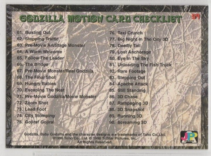 1998 Toho GODZILLA Movie Foil card #59 checklist . Card is in nice condition. Buyer to pay calculated shipping charges. I am happy to combine items to save you the most on shipping so please visit my ...