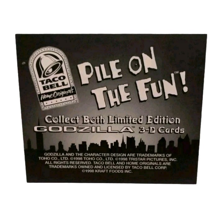 The 1998 Tristar Taco Bell Godzilla 3D Lenticular Promo Card is a unique and collectible trading card featuring the iconic character Godzilla. Manufactured by Tristar in 1998, this original promo card offers a fun and interactive experience with its 3D lenticular design. This non-sport trading card is a must-have for fans of the Godzilla franchise and collectors of unique vintage items. The card is a single piece from the modern era and is not professionally graded, adding to its authenticity and value for enthusiasts of the genre.