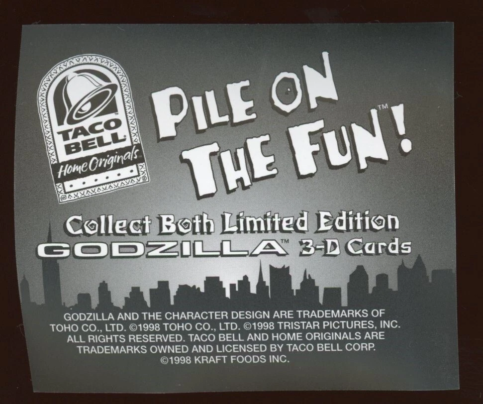 1998 Tristar Taco Bell Godzilla 3D Lenticular Promo Card Description Attached is a high resolution scan of the card for sale Shipping Terms Upon receipt of payment, items will typically ship within 1-2 business days. If multiple items are purchased together, shipping will be automatically combined at checkout. About Us BBC Emporium is always aggressively buying sports cards from 1975 and older. We travel the entire country and always offer competitive pricing. Contact us for a quote on your collection.