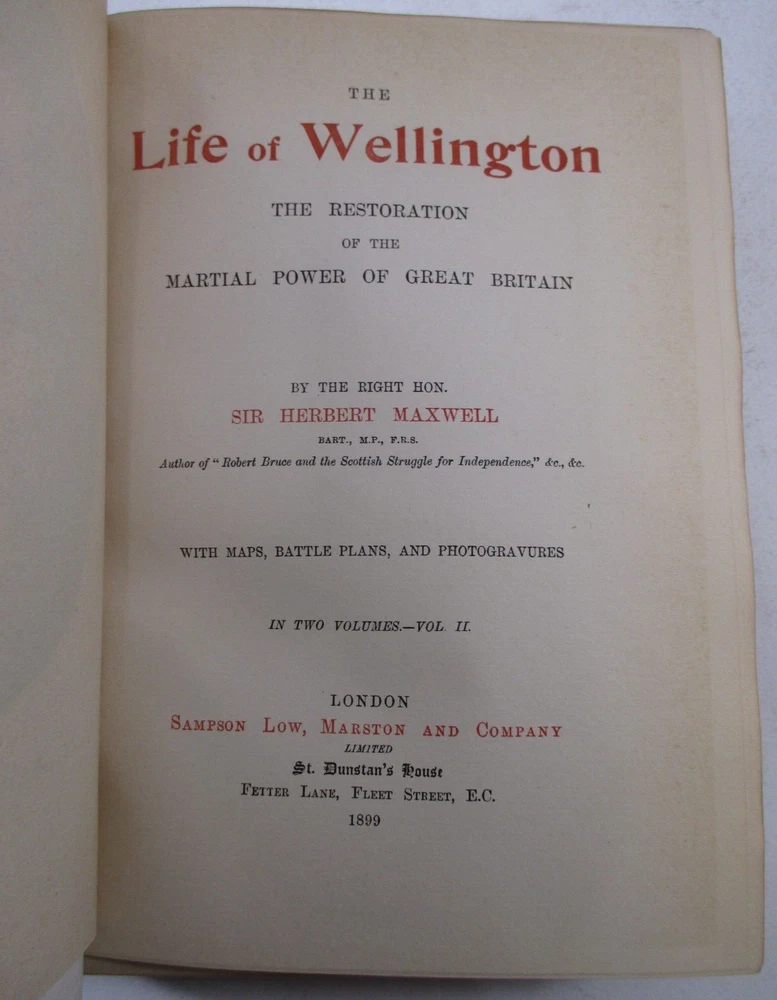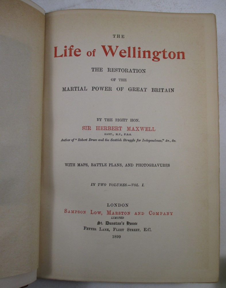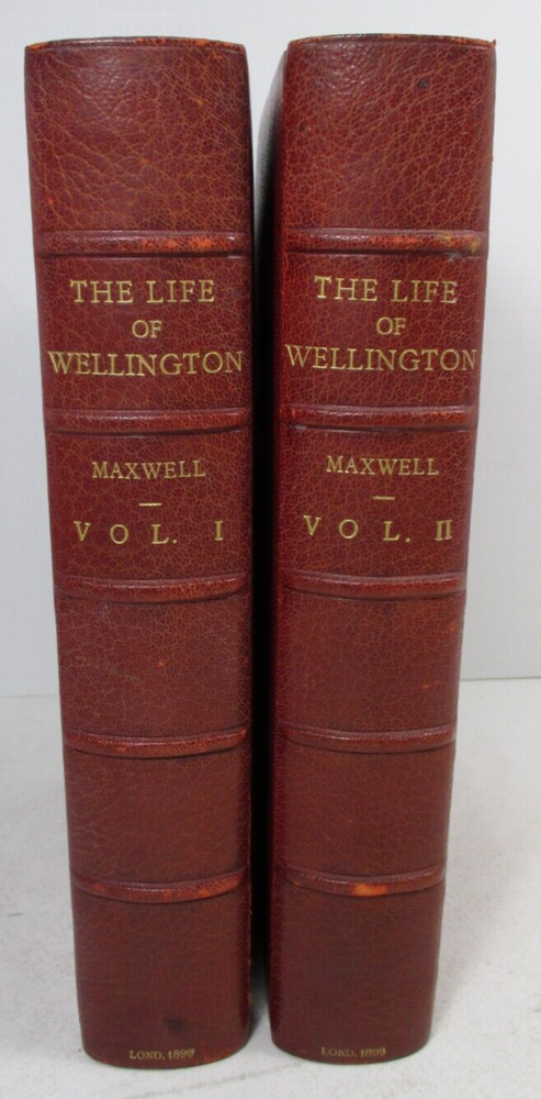 For sale is an excellent condition, professionally rebound first edition 2 Vol set of The Life of Wellington: The Restoration of the Martial Power of Great Britain by Sir Herbert Maxwell. Both books have been professionally rebound in leather by famous bookbinder Robert Riviere & Sons. Published in 1899 by Sampson Low, Marston and Company in London. Includes several fold out maps and photographs . Binding is tight and pages are unmarked, with the exception of light age toning and a bookplate on inner front hardboard boards from previous owner Adam Rivers Steele. Leather hardboards are clean and square with only light shelf wear. Leather spine looks excellent with bright title gilding. Please see photos for condition detail. shelf reference #L-1218