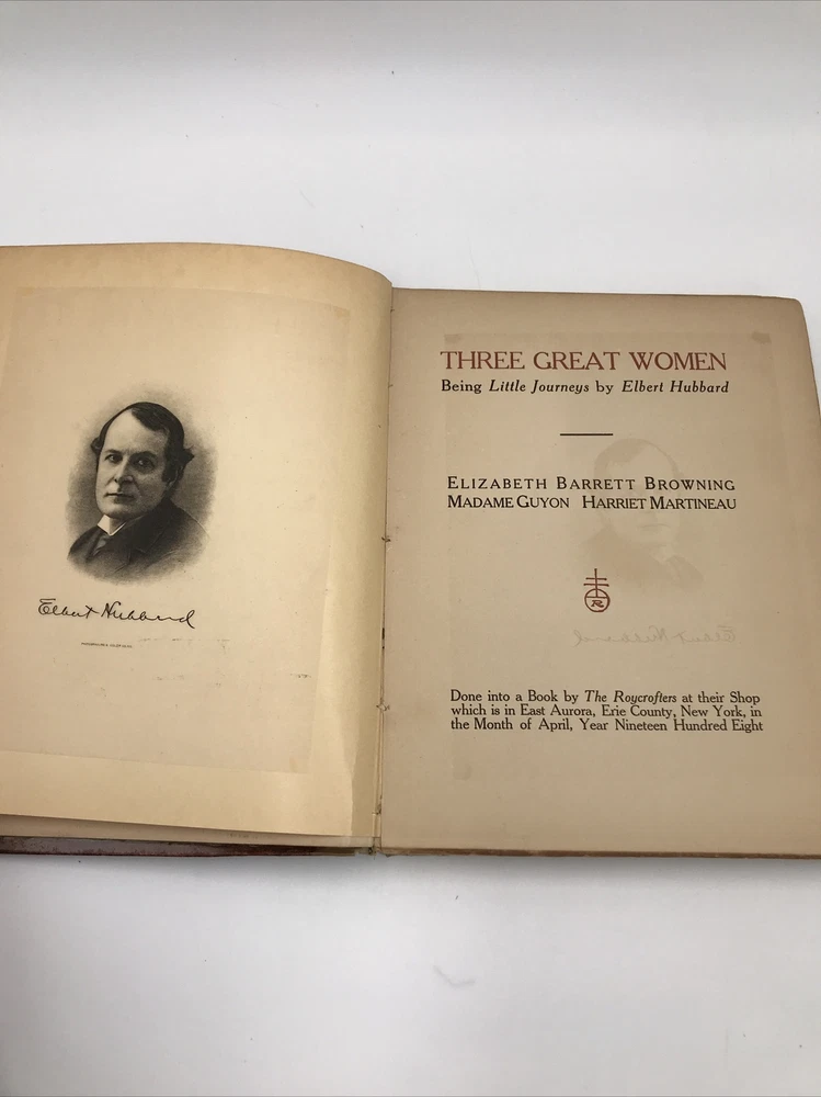 1st Edition Elbert Hubbard Three Great Women The Roycrofters April, 1908. Book has issues as seen in the pictures but would be great for any collector. Shipped with USPS Media Mail.